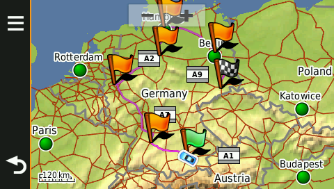 Wird die Karte während der Navigation von Hand verschoben, wird die Moving Map beendet und die Karte kann manuell verschoben werden. Über die kleine Kompassnadel links oben kann die Kartenansicht in diesem Modus leicht genordet und in eine 2D-Ansicht umgestellt werden.