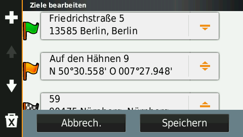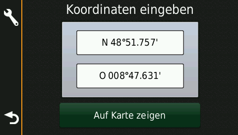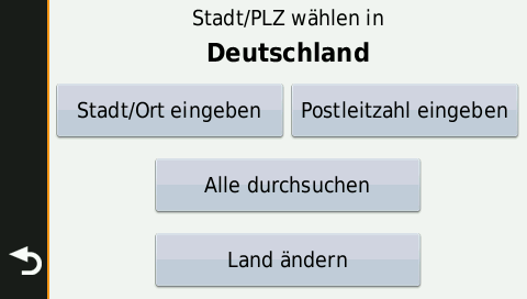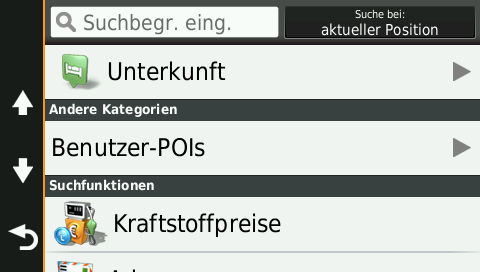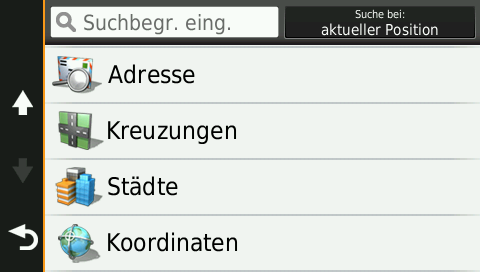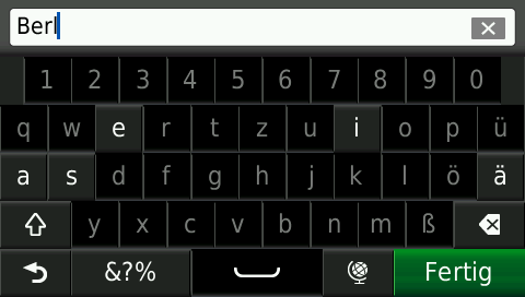 Um die Eingabe von Orts- und Straßennamen zu erleichtern, blendet das Navi nicht mehr mögliche Buchstabenkombinationen automatisch aus. Als weitere Zieleingabemethoden stehen letzte Ziele, Favoriten, Sonderziele und Ziele aus der Karte zur Verfügung. Auch die Suche nach Koordinaten in verschiedenen Formaten ist möglich.