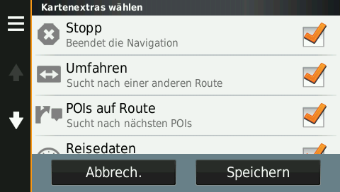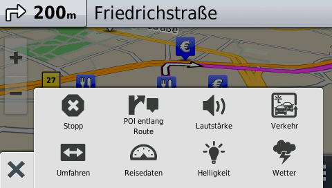 Auf der Karte gibt es ein Schnellzugriffsmenü, mit dem der Nutzer direkt auf wichtige Funktionen zugreifen kann, um die Route zu beenden, POIs entlang der Route zu suchen, Verkehrsmeldungen einzusehen, die Helligkeit oder die Lautstärke zu ändern. Leider lassen sich die Menüpunkte in diesem Schnellauswahlmenü nur bedingt anpassen. Vermisst man eine Option, kann diese während der Fahrt nur sehr umständlich über das normale Einstellungsmenü nach dem Verlassen der Karte geändert werden.