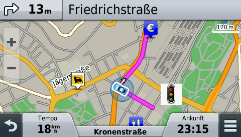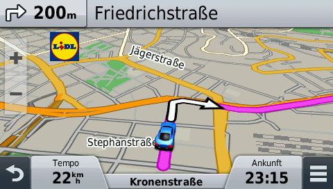 Das wesentliche Merkmal der visuellen Zielführung ist die Karte, welche wahlweise in 3D-Ansicht, in 2D-Ansicht, genordet oder in Fahrtrichtung ausgerichtet angezeigt wird. Die automatische Kartennachführung lässt sich durch ein Verschieben der Karte außer Kraft setzen, so dass man auch während der Navigation einen Blick voraus nehmen kann, um z.B. bei einer Stausituation eine Einschätzung der Alternativen vorzunehmen.
