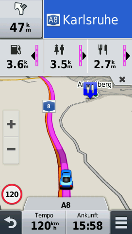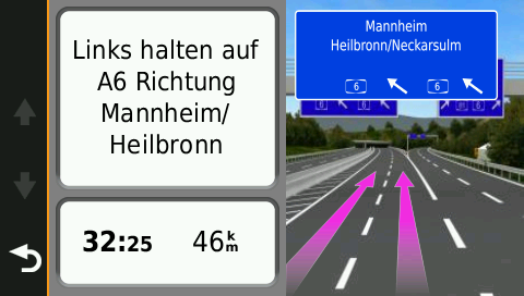 Die Karte wird aktionsabhängig automatisch gezoomt, wobei auch eine dauerhafte oder zeitweise Deaktivierung des Autozooms möglich ist. Neben der Karte unterstützen vor allem die sog. Photo Real Junction Views die Navigation. Garmin zeigt bei komplizierten Autobahnkreuzen oder Ausfahren eine geteilte Kartenansicht, welche auf der rechten Seite eine sehr realistische Darstellung der Umgebung und des Straßenverlaufes sowie der Richtungsbeschilderung anzeigt. Leider sind die Beschilderungen teilweise recht klein, so dass es nicht ganz einfach ist, diese abzulesen. Zusammen mit der Sprachausgabe, welche die Beschilderung vorliest, ist die realistische Ansicht jedoch eine gute und effektive Hilfe zur sicheren Navigation. Schade, dass diese Art der Hilfe auf Autobahnen beschränkt ist, als Nutzer würde man sich eine solche Ansicht auch im komplexen innerstädtischen Bereich wünschen. Ergänzend wird an einigen Autobahnkreuzen auch ein erweiterter Fahrspurassistent eingeblendet. Er weist in einer mitlaufenden Animation den Weg auf die richtige Spur.