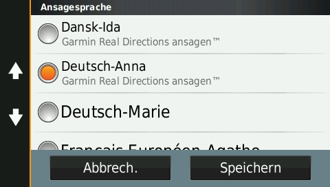 Es stehen zwei weibliche deutsche Stimmen zur Verfügung. Eine der beiden Stimmen ist eine sog. Text-to-Speech-Stimme und sagt Orts- und Straßennamen an, ebenso wie Richtungen und sog. Real Directions. Unter Real Directions versteht Garmin die Ansagen von Ortsmerkmalen wie z.B. „an der Ampel rechts abbiegen“ oder „am Stoppschild links abbiegen„. Allerdings sind die Real Directions bei weitem noch nicht so umfangreich, wie in der neuesten Garmin Serie Nüvi x9.
