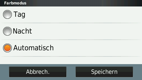 In der Nachtansicht wechselt das Navi zwar die Farben der Karte, doch wird die Displayhelligkeit dabei nicht automatisch gesenkt. Auch separate Einstellungsmöglichkeiten für die Helligkeit in der Tag- und Nachtansicht gibt es nicht. Damit das Display während Fahrten in der Dunkelheit nicht blendet, empfiehlt es sich die Displayhelligkeit über die Einstellungen zu regulieren. Der Wechsel in die Nachtansicht kann automatisch erfolgen oder manuell eingestellt werden.