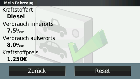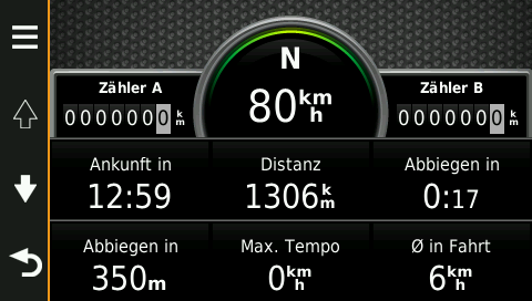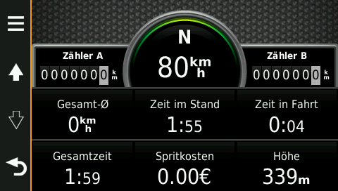 Eine Art Reisetagebuch ist über die Wo-war-ich-Funktion aufrufbar. Sie zeigt die Haltepunkte des jeweiligen Tages chronologisch geordnet an. Bei Bedarf können die Informationen per Knopfdruck wieder vom Gerät gelöscht werden. Schon seit jeher ist auch der sehr umfangreiche und aussagekräftige Cockpitmodus eine Besonderheit der Garmin-Navigationsgeräte. Dieser lässt sich am einfachsten über die Karte durch einen Klick auf das Feld für die Anzeige der Geschwindigkeit aktivieren. Hier wurden interessante Informationen wie zwei getrennte Kilometerzähler, das maximale Tempo, die Durchschnittsgeschwindigkeit in Fahrt und insgesamt, die verbrauchten Spritkosten und die Fahrzeiten platziert.