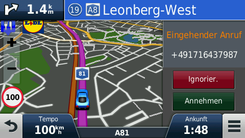 Im Vergleich zu den üblichen Navigationsfunktionen eines Mittelklasse-Navis verfügt das nüvi 2517 LMT über weitere Features, mit denen der Alltag auf dem Weg zum Ziel noch komfortabler wird. Besonders erwähnenswert ist hierbei die Bluetooth-Unterstützung, durch die das Navigationsgerät in Verbindung mit einem Smartphone auch als Freisprecheinrichtung genutzt werden kann. Bei eingehenden Anrufen wird ein entsprechender Hinweis auf dem Bildschirm angezeigt und das Telefonat kann angenommen oder abgewiesen werden. Auch das Anrufen eines auf dem Smartphone befindlichen Kontakts oder einer noch nicht gespeicherten Nummer ist möglich. Das Smartphone kann auf diese Weise während der Fahrt sicher in der Tasche bleiben.