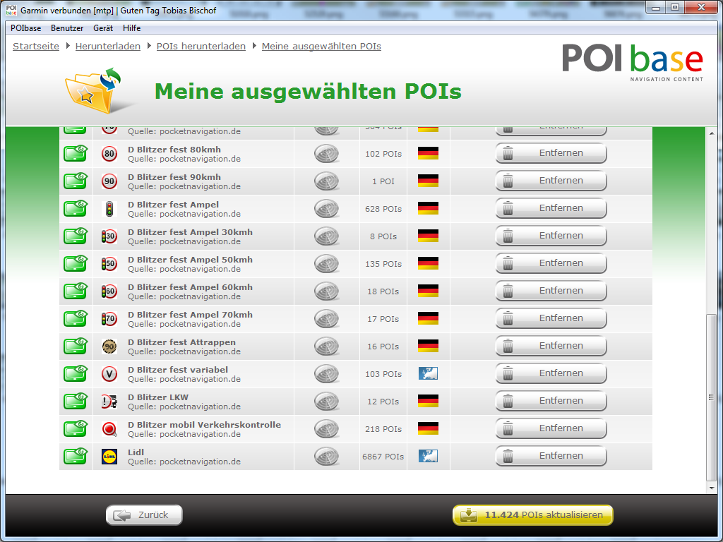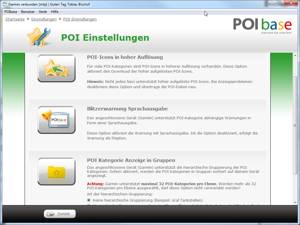 Auch eine Warnung vor einzelnen POI-Kategorien kann eingestellt werden. POIbase kann die akustischen Hinweise, die auf dem Gerät nur als Piepton vorhanden sind, gegen gesprochene Warnungen austauschen. Besonders praktisch ist dies an Blitzern, da man so weiß, welche Höchstgeschwindigkeit erlaubt ist, ohne noch einmal auf das Display des Navigationsgerätes schauen zu müssen.
