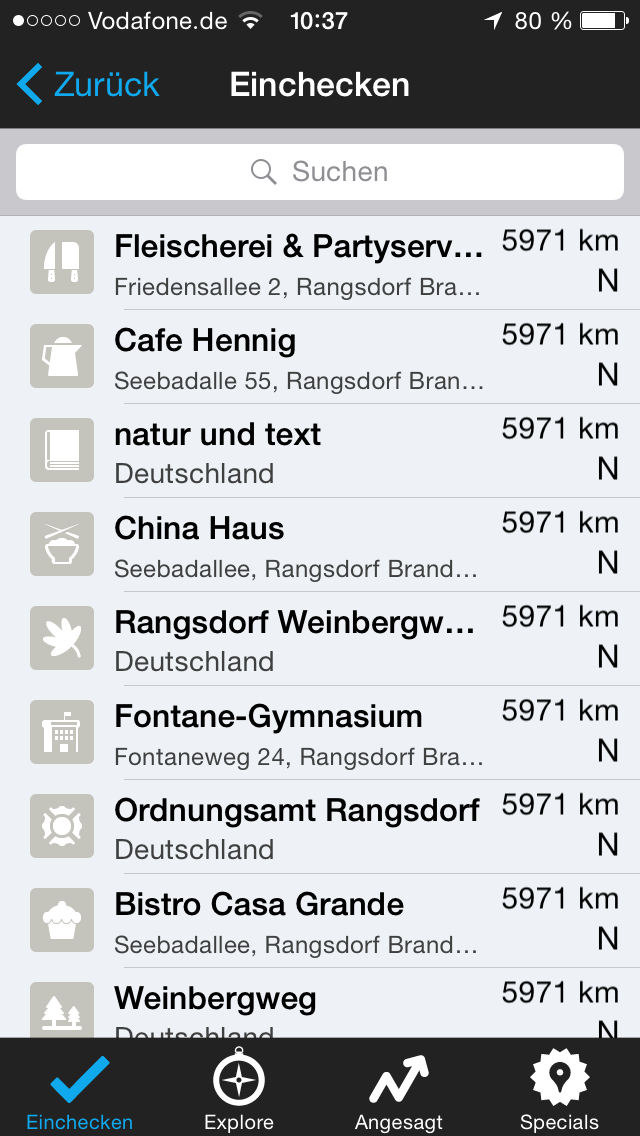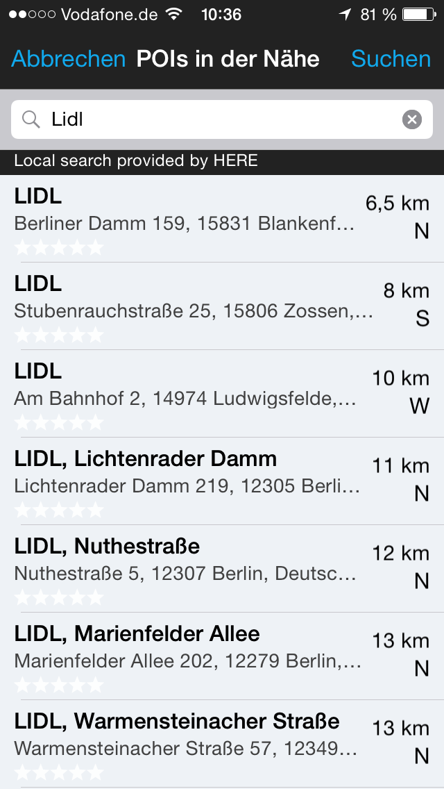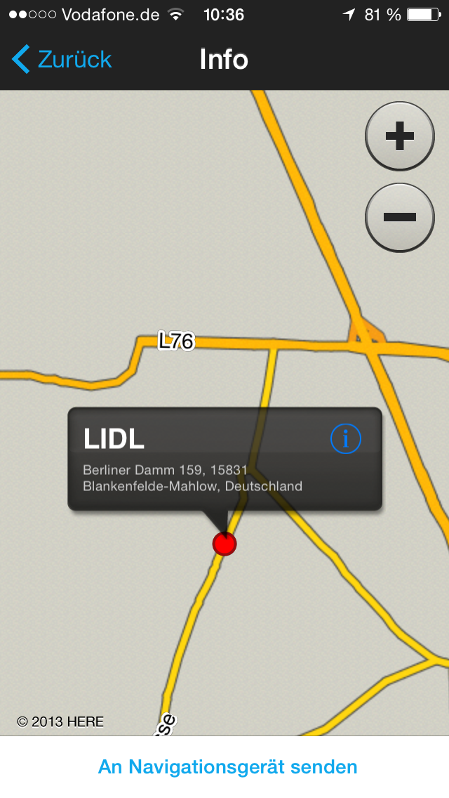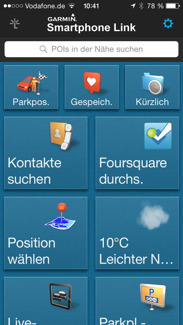 Die Smartphone-Link-App dient aber nicht nur als Datenlieferant für Dienste auf das Navigationsgerät, mit ihr kann auch bequem nach einem Sonderziel aus den POIs oder der Foursquare Community gesucht werden. Anschließend kann das gefundene Ziel auf das Navi an der Windschutzscheibe gesendet und die Navigation nach einer kurzen Bestätigung begonnen werden. Das Gleiche ist auch mit Adressen, die in den Kontakten des Telefonbuchs des Smartphones hinterlegt sind, zu bewerkstelligen. Etwas unverständlich ist, weshalb die Eingabe einer kompletten Adresse nicht über die Smartphone-Link-App erfolgen kann. Praktisch ist auch das Speichern der eigenen Parkposition oder das Aufrufen der aktuellen Verkehrslage direkt über die App. Die Parkposition kann alternativ auch direkt auf dem Navigationsgerät gespeichert werden. Die Funktion weist sowohl auf dem Navi als auch in der App den Weg zurück zum Fahrzeug.
