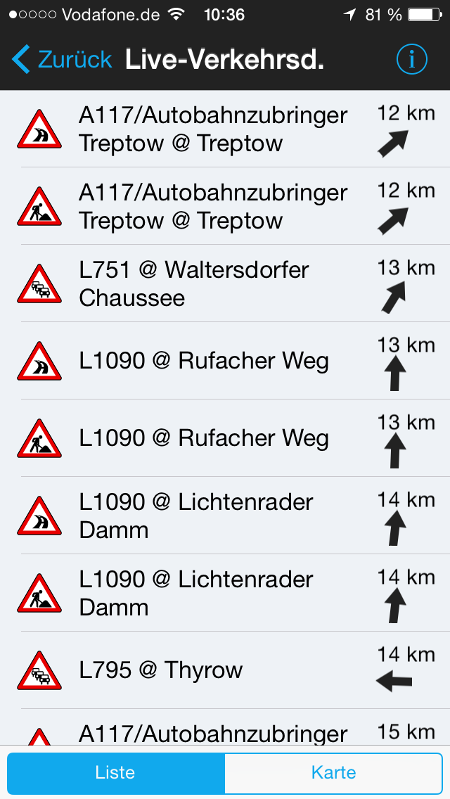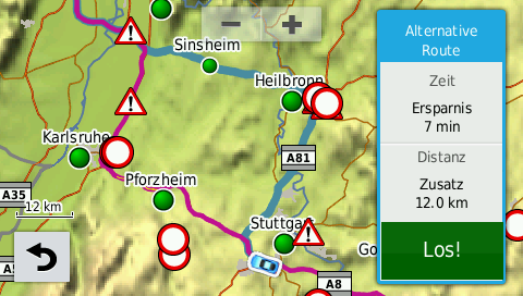 Die Visualisierung der Meldungen auf der Karte kann als sehr gelungen bezeichnet werden. Eine Legende informiert über die unterschiedlichen Arten von Verkehrsstörungen, ein Klick auf das Störungssymbol öffnet eine Detailansicht zur Störung. Die Verkehrslage auf der aktuellen Route kann eingeblendet werden, alle Verzögerungen werden ausgerechnet und auf dem virtuellen Streckenverlauf eingezeichnet. Ein Klick auf die Verzögerung führt auf eine spezielle Kartenansicht, auf welcher bereits Alternativrouten für eine Umgehung berechnet wurden. So kann eine Umgehung leicht kontrolliert und entsprechend gestartet oder abgelehnt werden.