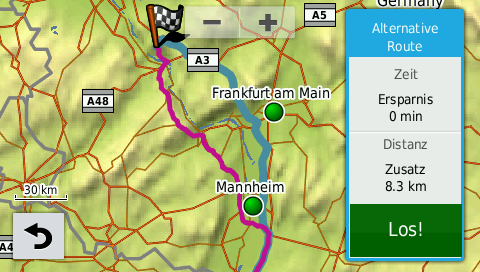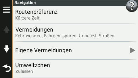Die Routenberechnung des Garmin Nüvi 2517 lieferte in unserem Test gute und schnelle Berechnungen und passende Routen ohne grobe Fehler. Der Nutzer kann die Routenberechnung über unterschiedliche Einstellungen beeinflussen: Schnelle Route, Kurze Route, wirtschaftliche Route und Luftlinie. Dann gibt es noch unterschiedliche Vermeidungen wie: Kehrtwenden, Autobahnen, Mautstraßen, Fähren, Fahrgemeinschaftsspuren, unbefestigte Straßen und Umweltzonen. Über diese allgemeinen Vermeidungen hinaus, können einzelne Straßen und auch Gebiete individuell und dauerhaft gesperrt werden. Während einer laufenden Navigation kann eine Strecke voraus über das Schnellmenü gesperrt werden, auch bestimmte Straßen innerhalb der Route lassen sich vermeiden. Voraussetzung zur Nutzung dieser Funktion ist es, dass man das Schnellmenü in den Einstellungen entsprechend konfiguriert hat.