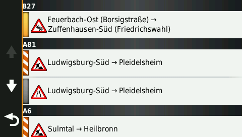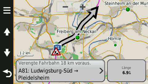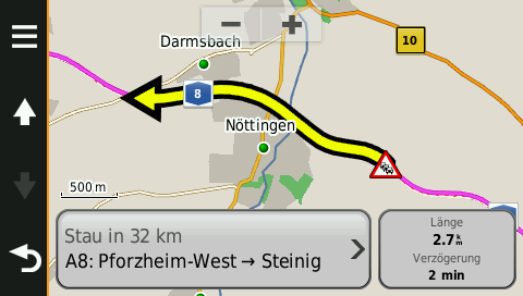 Über den mitgelieferten Kfz-Lader empfängt das nüvi 2517 automatisch TMC-Nachrichten. Alternativ kann über ein gekoppeltes Smartphone (Details unter weitere Funktionen) der lebenslang kostenlose HERE-Traffic-Service, welcher wesentlich mehr und aktuellere Informationen über Verkehrsstörungen liefert, genutzt werden. Vor allem im innerstädtischen Bereich, in dem über TMC in der Regel keine Störungen gemeldet werden, ist der Live-Traffic-Service deutlich im Vorteil. Meldungen sind auf der Karte sichtbar und können automatisch oder nach Rückfrage zur Verbesserung der Route verwendet werden. Gut gefallen hat uns die Einstellung, entweder nur schwere oder schwere und leichte Behinderungen zu beachten. So erspart man sich unnötig viele Meldungen, welche in der Regel ohnehin keine Umfahrung wert sind.