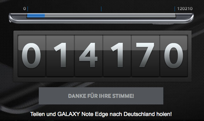 Noch bis zum 10. November kann auf der Samsung-Webseite darüber entschieden werden, ob es das Samsung Galaxy Note Edge auch hierzulande in den Handel schafft. Die Abstimmung erfolgt über die Schaltfläche VOTE FÜR DAS NOTE EDGE auf www.samsung.de. Kommen bis zum Ablauf der Aktion insgesamt 120.210 Stimmen zusammen, wird Samsung das Galaxy Note Edge als Premium Edition in einer limitierten Stückzahl mit zusätzlichen Extras auf den deutschen Markt bringen. Teilnehmer können das Voting über verschiedene Netzwerke mit ihren Freunden teilen. Ob hinter der Aktion wirklich die Absicht einer Abstimmung steckt oder ob angesichts der niedrigen Anzahl benötigter Stimmen sowie der recht schnell in Aussicht gestellten Verfügbarkeit des Gerätes alles nur ein ausgeklügelte Marketingkampagne ist, sei dahingestellt.