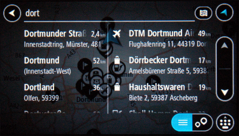 Denn lediglich die Kategorien Tankstellen und Parkplätze können direkt über die Menüoberfläche des Navigationsgeräts angewählt werden. Alles andere ergibt sich aus der jeweiligen Sucheingabe des Nutzers. So gerät z.B. die Recherche nach den nächsten Supermärkten deutlich aufwändiger als gedacht, denn nach Eingabe des Wortes „Supermarkt“ taucht außer Treffern mit dem Wort im Namen in der POI-Spalte lediglich die allgemeine Kategorie „Geschäfte“ auf, was die Suche nicht unbedingt vereinfacht. Es wäre deshalb wünschenswert, dass die unbestritten sehr leistungsfähige Adressensuche noch um einen gut strukturierten Zugriff auf den üppigen POI-Bestand erweitert würde. Ebenfalls auf unserer Wunschliste findet sich die Integration von nutzergenerierten POIs um auch die Sonderziele von POIbase mit in die Navigation einbinden zu können. Doch hier hat TomTom mittlerweile Nachbesserung angekündigt.