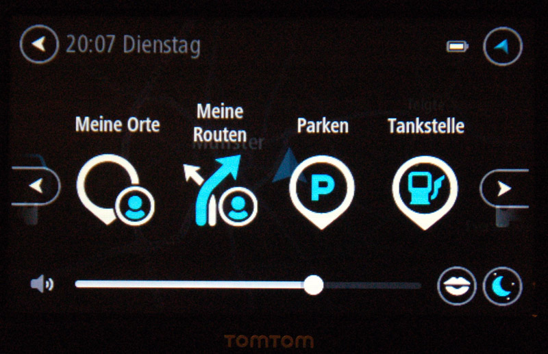 Die Schaltflächen fallen zumeist groß aus und stellen auch Grobmotoriker vor keine nennenswerten Schwierigkeiten. Lediglich das horizontale Verschieben der Menüleiste mittels Wischbewegung gelang zunächst nicht immer fehlerfrei. Doch TomTom zeigt sich in diesem Punkt lernfähig, mit dem letzten während des Testzeitraums installierten Software-Update (13.060.1661805.111) wurden dem Menü Schaltflächen zum horizontalen Bewegen spendiert. Jetzt klappt auch dieser Vorgang zuverlässig.