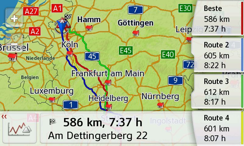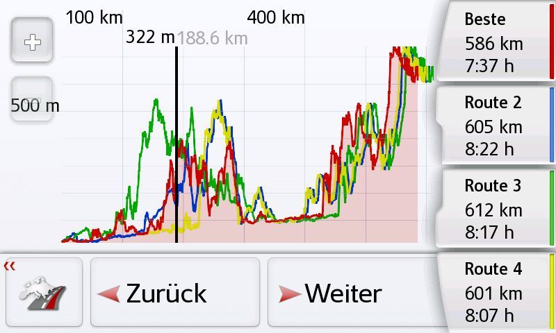Die Anzeige des Höhenprofils für alle geplanten Routen ist ebenfalls eine Funktion, über die lediglich die Transit-Modelle von Becker verfügen. Damit kann der Fahrer die zurückzulegenden Höhenmeter aller berechneten Alternativen miteinander vergleichen und entscheiden, welche die beste Route ans Ziel ist. Besonders bei schwer beladenen LKWs kann mit der Auswahl einer Route mit wenigen Höhenmetern viel Kraftstoff eingespart werden.