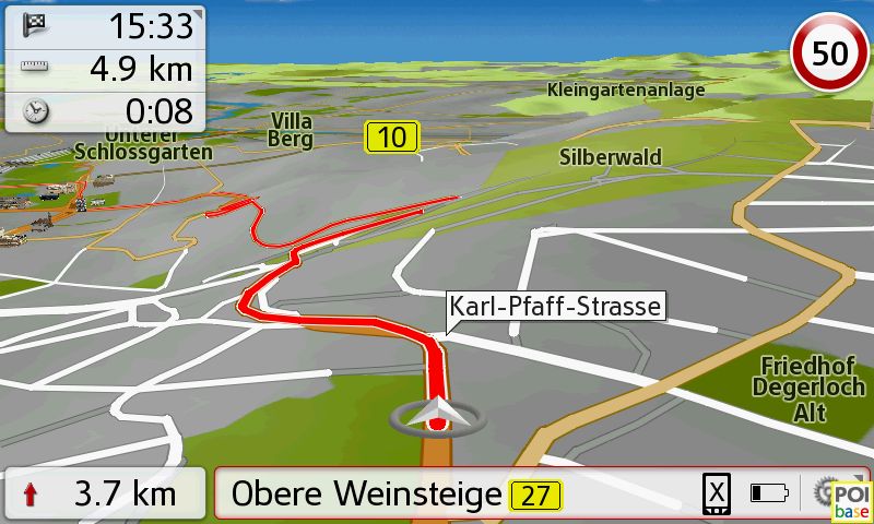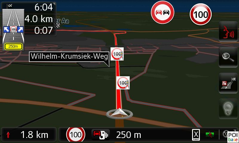 Zu den vorinstallierten Sonderzielen und der online Live POI-Suche, kann auf dem Gerät auch die Zusatzsoftware POIbase mobile installiert werden. Sie bietet Zugang zu 1.000.000 zumeist kostenlosen POIs. Aufpreispflichtig hingegen sind Informationen über Tankstellen mit günstigen Preisen und Standorten von mobilen und festen Blitzern. Diese Investitionen lohnen sich jedoch, denn wird der LKW voll getankt, handelt es sich nicht um 50 – 100 Liter Kraftstoff, sondern schnell um 1000 Liter und mehr. Ein paar Cent Unterschied je Liter können da an der Zapfsäule schon ein ordentliches Ersparnis ausmachen.