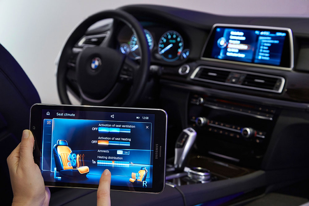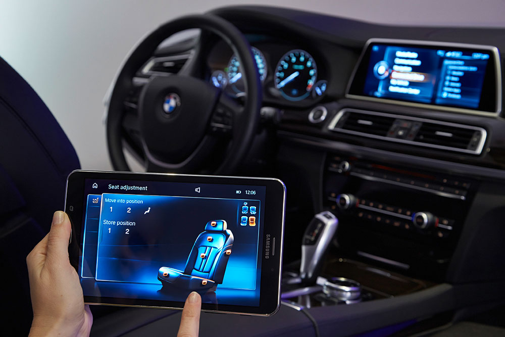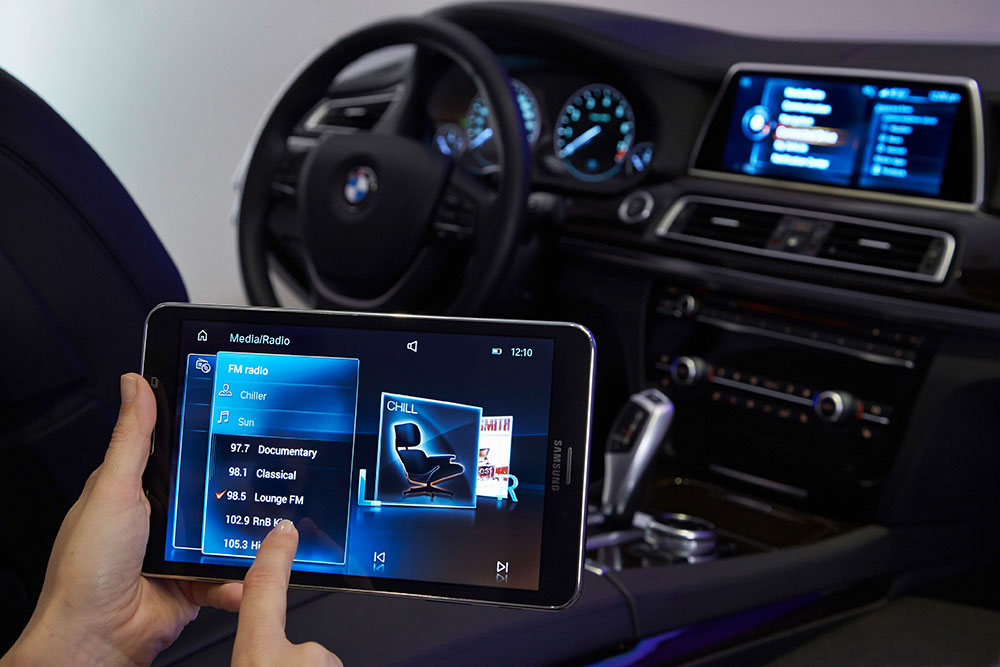 Per WLAN wird das Samsung Tablet mit dem Fahrzeug verbunden. Auf ihm ist eine spezielle BMW App vorkonfiguriert, mit der sich das Infotainment- und Entertainmentangebot des Autos bedienen lassen. Zudem können über das Tablet auch die Klimaanlage oder die Sitze verstellt werden. Während der Fahrt wird das Tablet bei Nichtbenutzung sicher in einer Halterung befestigt, über die es auch aufgeladen wird.