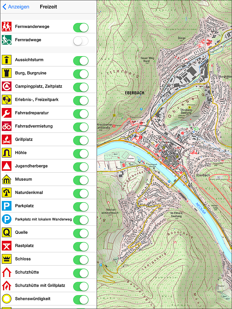BW Map mobile nutzt die Freizeitinformationen der topographischen Karten interaktiv und öffnet über Fenster Objektsteckbriefe von Hauptwanderwegen und Radfernrouten. Angetippte Freizeitsymbole sind mit den jeweiligen Homepages verlinkt, um sich über Öffnungszeiten, Einkehrmöglichkeiten oder die nächstgelegene Fahrradreparaturwerkstatt tagesaktuell informieren zu können.