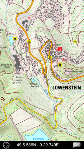 Mit der Moving-Map-Funktion richtet sich die Karte in Laufrichtung aus. Zusätzlich lassen sich Kartenfehler melden und per E-Mail an das LGL senden.