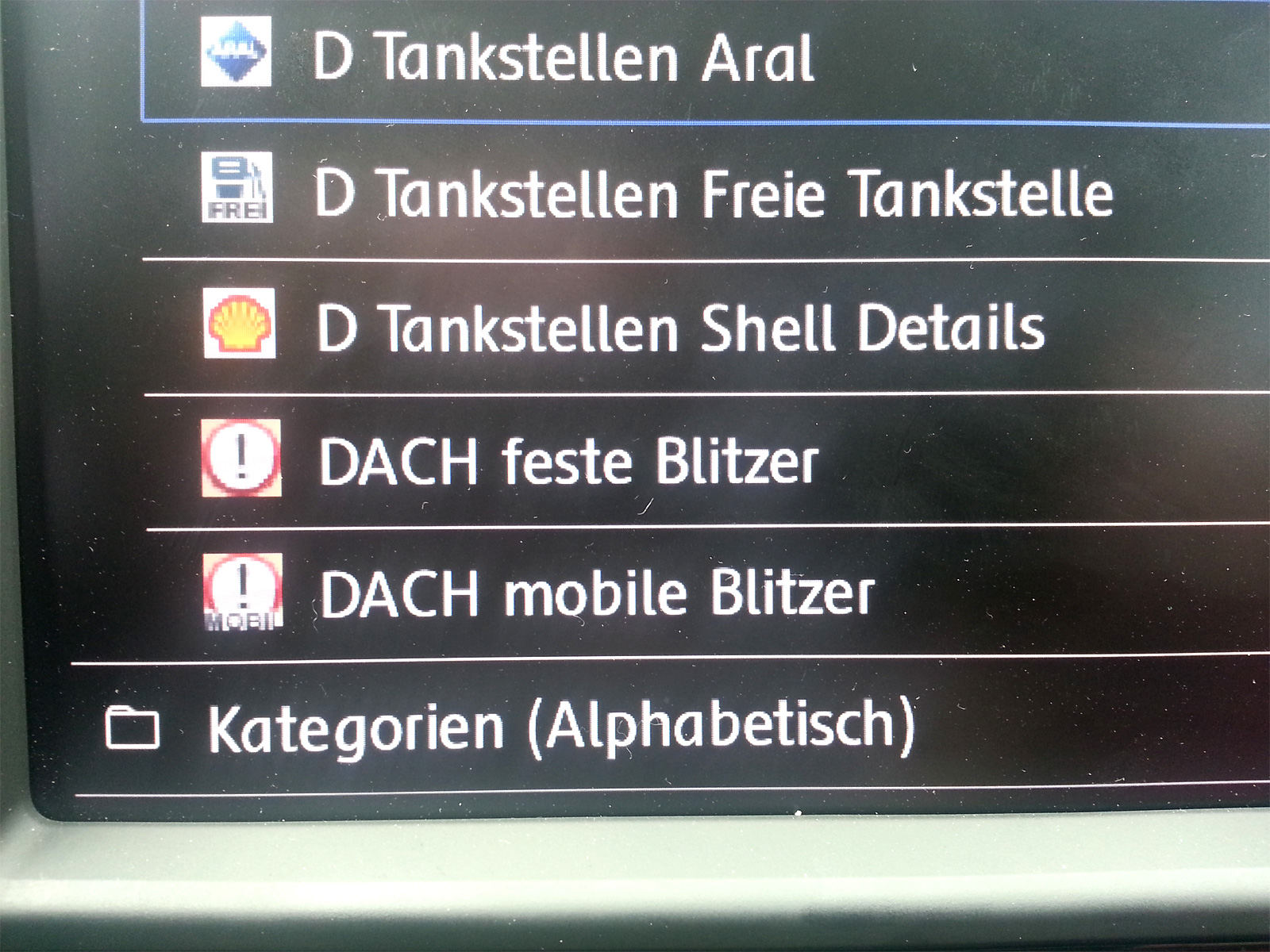 POIs wie Tankstellen und Parkplätze sollten bereits auf Deinem Discover Media vorhanden sein. Unter “NAV” -> “Setup” -> “Karte” -> “Kategorie für Sonderziele“ kannst du die einzelnen Kategorien auch zur Anzeige aktivieren. Sollten Dir POIs fehlen oder wenn Du Blitzerdaten installieren möchtest, kannst Du diese mit POIbase nachinstallieren. Wie das funktioniert ist hier beschrieben https://www.pocketnavigation.de/pois/pois-blitzer-vw-navigationssysteme/vw-discover-media-mj2016/