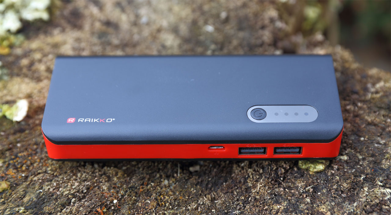 Der Raikko 8800 ist mit einem Gewicht von 226 Gramm bereits einer der größeren externen Akkus und nur noch bedingt hosentaschentauglich. Er besteht aus hartem Kunststoff und wirkt insgesamt weniger wertig als der sehr ähnliche Raikko 11000, welcher mit einer leicht gummierten Oberfläche überzogen ist. Vier blaue LEDs zeigen per Knopfdruck den Ladezustand des Akkus an.