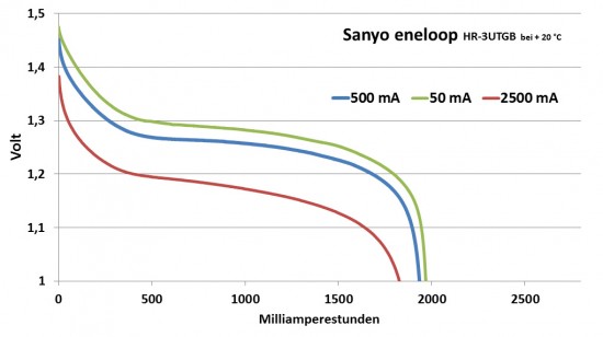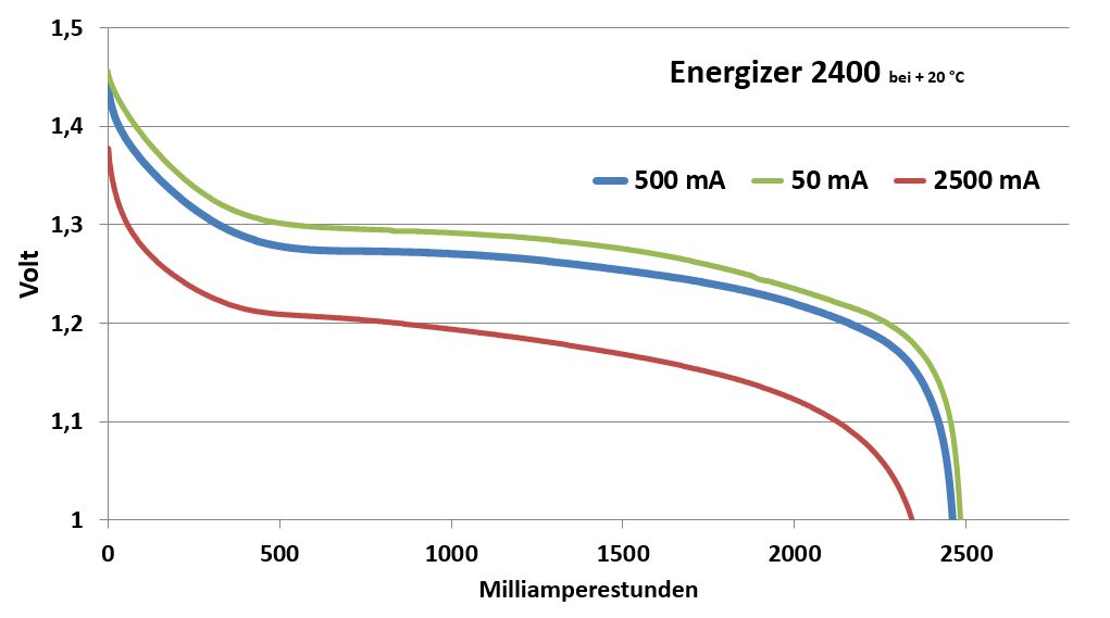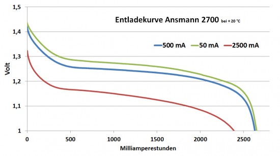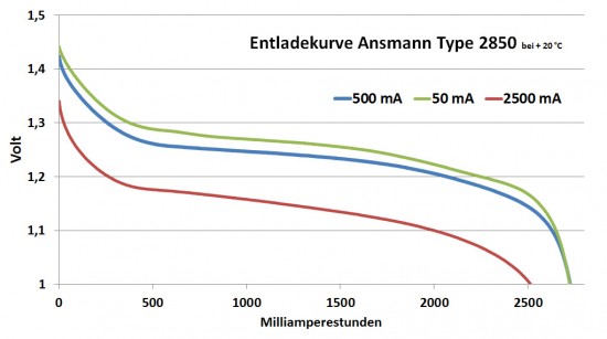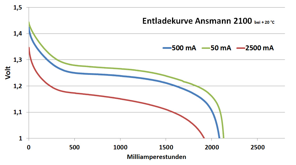 Der Ansmann NiZn 2500 nimmt als Nickel-Zink Akku eine Sonderstellung in diesem Vergleich ein. Nickel-Akkus haben mit 1,6 Volt gegenüber NiMH-Akkus mit nur 1,2 Volt eine deutlich höhere Spannung und eine zum Ende hin steilere Entladekurve sowie eine höhere Entladeschlussspannung.