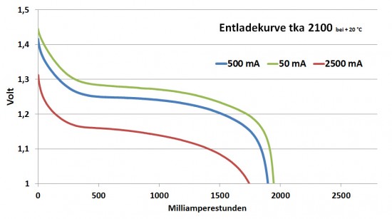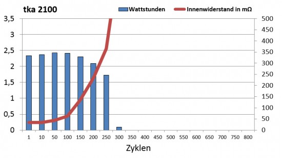 Für einen LSD-Akku verkraftet der tka 2100 erstaunlich wenige Zyklen. Immerhin relativiert sein geringer Preis diesen Umstand. Gemessen an LSD-Akkus, hat der tka 2100 gegenüber den Konkurrenten einen recht hohen Innenwiderstand und damit verbunden, eine etwas geringere Spannungslage. Demzufolge ist er für Hochstromanwendungen weniger geeignet. Der Akku ist auch bei Kälte einsatzfähig und hat normale Abmessungen.