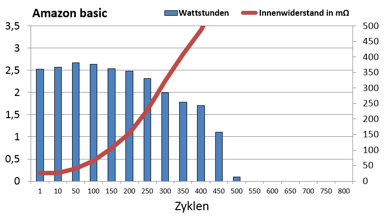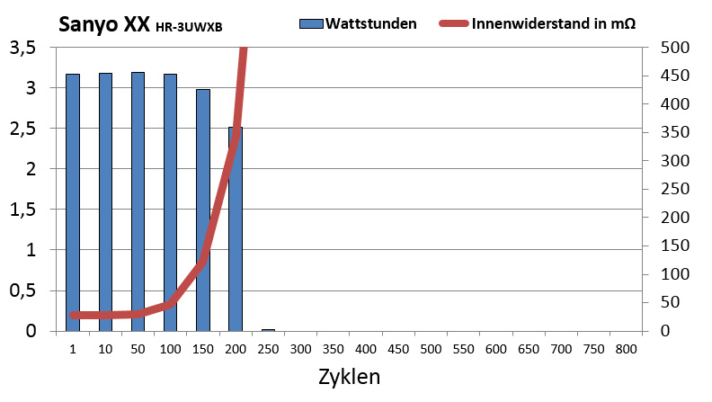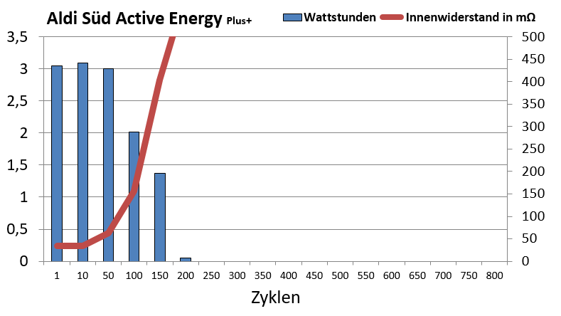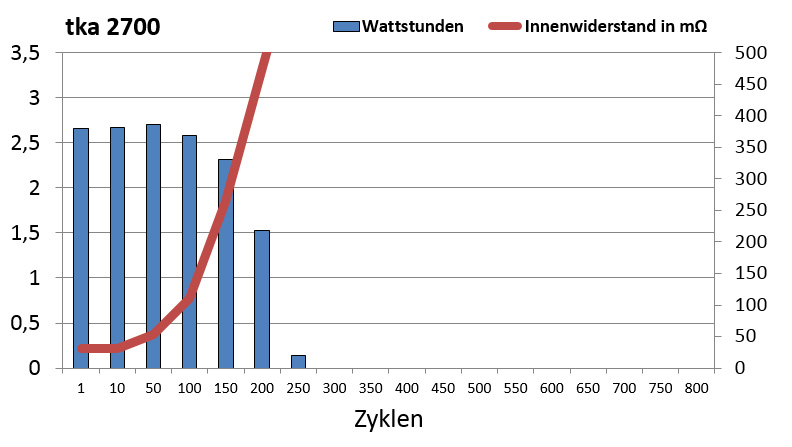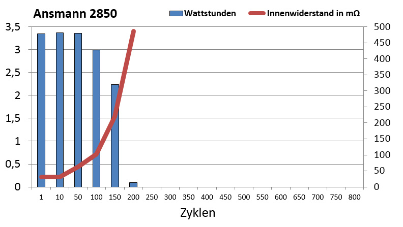 Die recht hohe Anfangskapazität hält nur gut 50 Lade-/Entladezyklen, danach beginnt ein rascher Kapazitätsverlust. Nach nur 136 Zyklen hat der Akku nur noch 50 Prozent seiner Kapazität und der Innenwiderstand geht bereits durch die Decke, was den weiteren Einsatz verhindert.