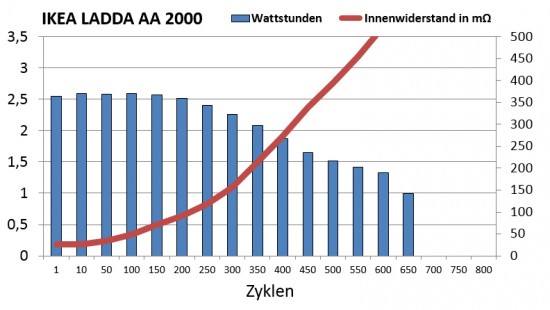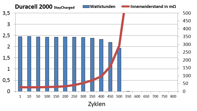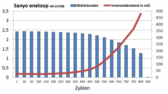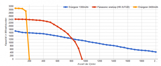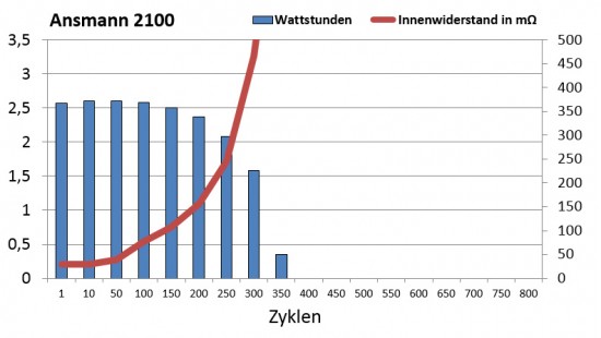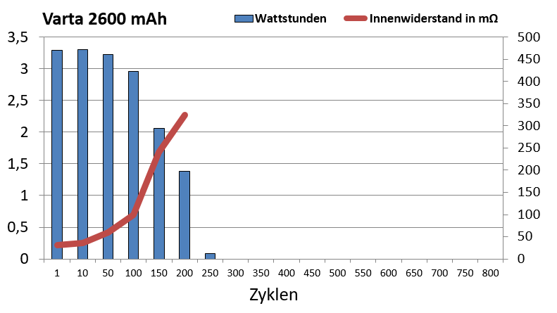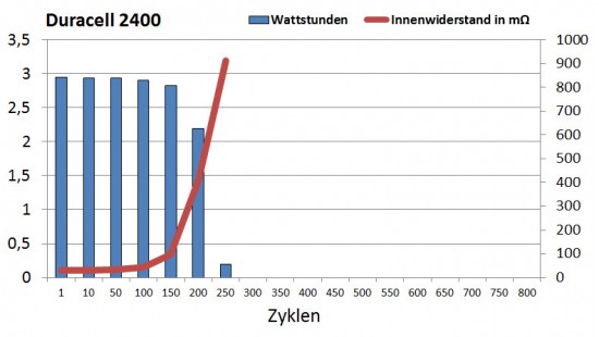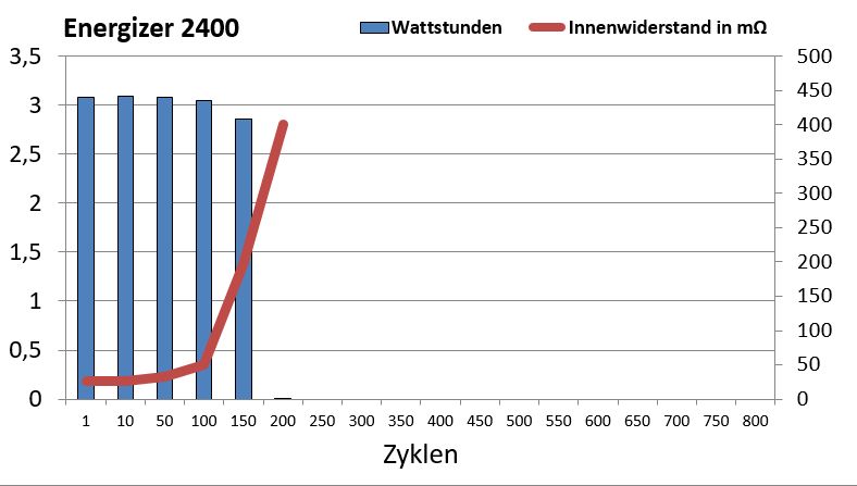 Die allesamt hervorragenden Eigenschaften des Energizer 2400 lassen sich leider nur über 100-150 Zyklen nutzen, ein im Vergleich zur Konkurrenz schlechter Wert. Nach gut 100 Zyklen steigt der Innenwiderstand sprunghaft an und bereitet dem Akku schnell ein Ende.