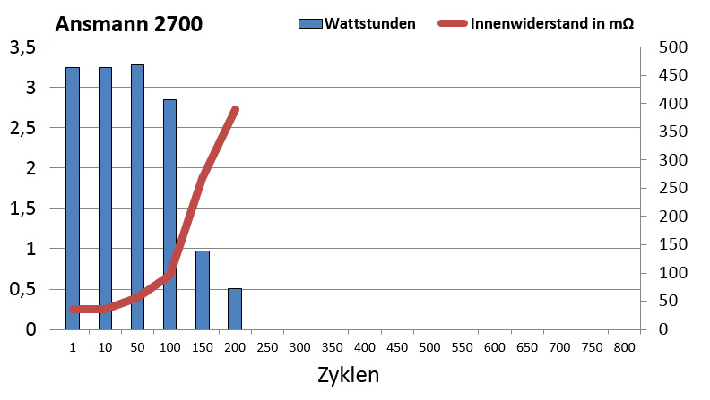 Der Ansmann 2700 zeichnet sich vor allem durch seine hohe Kapazität aus. Leider zeigt er alle typischen negativen Merkmale eines NiMH-Hochkapazitätsakkus und erreicht wenig Zyklen bei besonders hoher Selbstentladung. Bei Raumtemperatur verliert er bereits nach gut 6 Monaten seine Ladung vollständig und ist damit nur begrenzt lagerfähig. Der von Beginn an recht hohe Innenwiderstand macht den Akku weniger geeignet für Hochstromanwendungen.