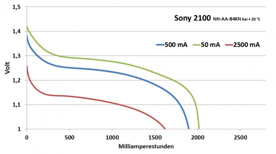 Die Kapazität liegt leider entgegen der Herstellerangabe bei nur 2,338 Wattstunden bzw. 1898 mAh, was jedoch für einen LSD-Akku kein ungewöhnlich schlechter Wert ist. Ärgerlich ist die falsche Herstellerangabe. Die höchste Kapazität wird erst nach ca. 50 Zyklen erreicht.