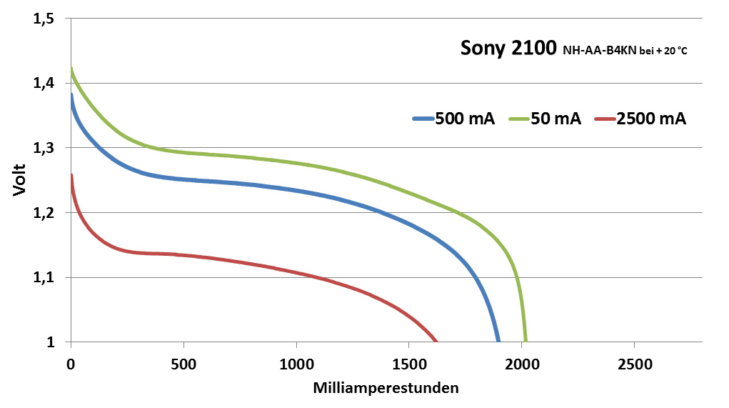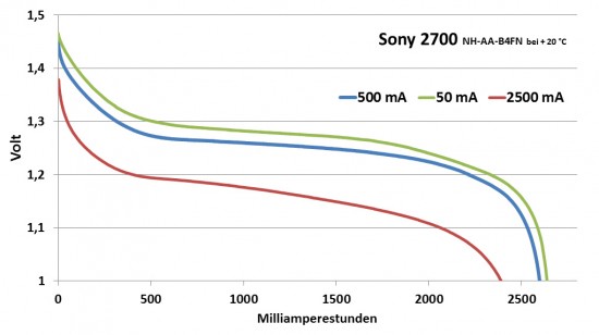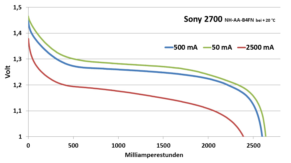 Der Sony 2700 ist ein typischer Hochkapazitätsakku und erfüllt das Herstellerversprechen von mind. 2500 mAh deutlich! Soweit so gut, wären da nicht die für High-Cap-Akkus typischen Nachteile. Die mittlere Spannung liegt dagegen verhältnismäßig hoch und führt damit zu einer guten Ausnutzung der Kapazität. Durch den recht hohen Innenwiderstand ist die Leistung bei extrem kalten Temperaturen nicht gut.