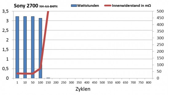 Mit nur knapp 150 Zyklen geht dem Sony 2700 schnell die Energie aus, damit speichert er in seinem Lebenszyklus weniger als 1/3 der Kapazität der besten LSD-Akkus (Panasonic eneloop). Der Einbruch der Kapazität setzt recht schlagartig ein.