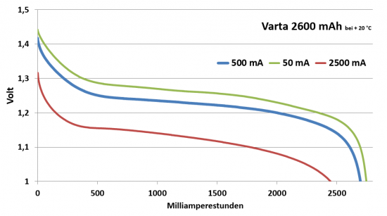 Der Varta 2600mAh übertrifft mit 2689mAh die vom Hersteller versprochene Kapazität und verfehlt damit nur sehr knapp die Bestmarke von 2724mAh des Ansmann 2850.