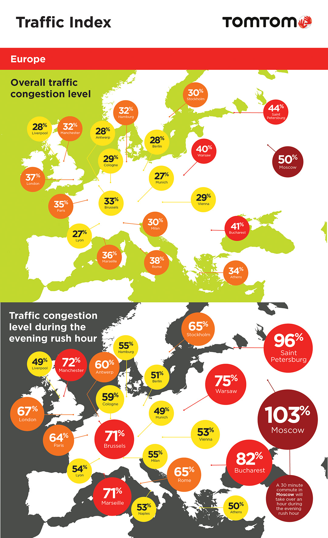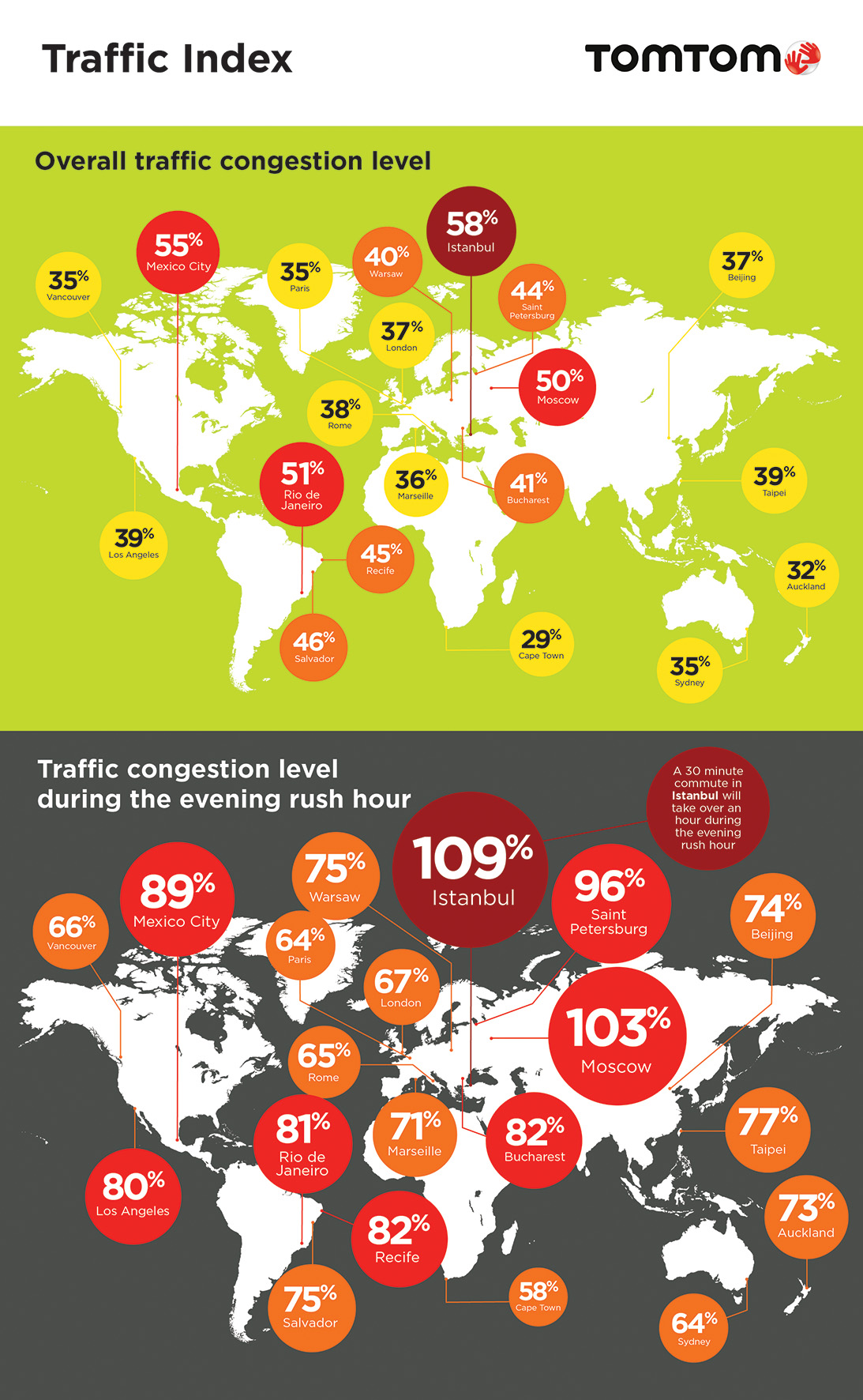 Im weltweiten Vergleich fließt der Verkehr in deutschen Städten vergleichsweise gut. Pendler in Istanbul, in diesem Jahr erstmals auf Platz 1 des weltweiten Rankings, benötigen für eine Strecke die bei freier Fahrt 30 Minuten dauert, in der abendlichen Rushhour über eine Stunde. In einem Jahr werden so ganze 125 Stunden verschwendet. Erwähnenswert ist die Verbesserung des allgemeinen Stau-Levels in Moskau um 16 Prozent.