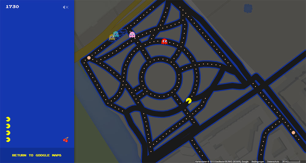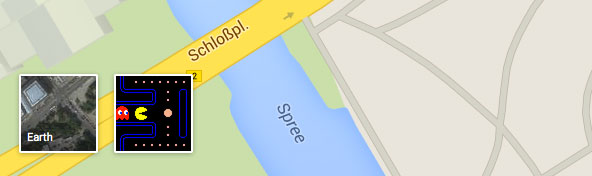 Der wohl allseits bekannte Videospiel-Klassiker Pacman kann direkt nach dem Aufruf von Google Maps über ein passendes Symbol links unten im Browser gestartet werden. Der aktuelle Kartenausschnitt wird dann zur Spielwelt, durch die Pacman mit den Pfeiltasten gesteuert wird und die auf den Straßen liegenden Punkte einzusammeln muss. Ganz wie im Vorbild versuchen ihm dabei die Geister Blinky, Pinky, Inky und Clyde in die Quere zu kommen. Zur normalen Google Maps kann der Spieler durch Drücken von ESC zurückkehren.