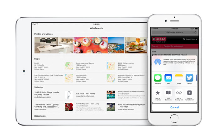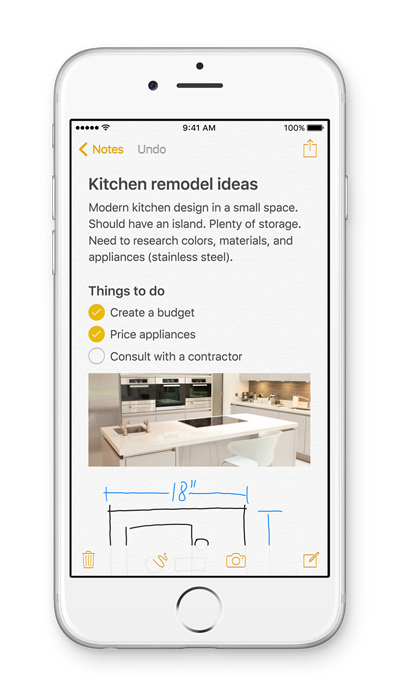 Überarbeitet wurde auch die Notes-App, mit der nun auch Notizen mit Bildern oder Zeichnungen per Hand angelegt werden können. Außerdem lassen sich weitere Informationen wie Links zu Webseiten oder Adressen aus der Karten-App in eine bereits bestehende oder eine neue Notiz einfügen.