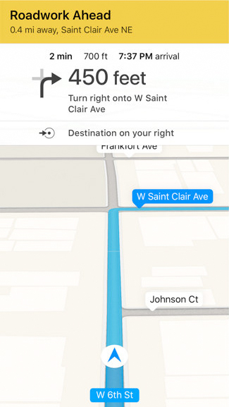Sofern die Sprachnavigation aktiviert ist, benachrichtigt Siri den Fahrer über mögliche Verkehrsprobleme auf der geplanten Strecke. Wenn die Sprachausgabe deaktiviert ist, informiert eine Banner-Anzeige auf dem Display über Verkehrsbehinderungen.