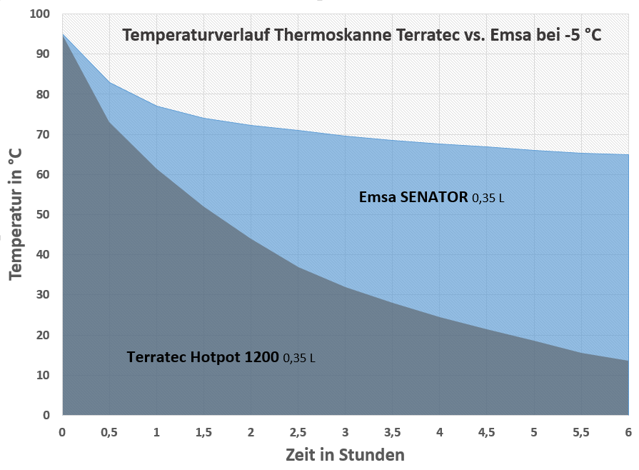Um den Widerspruch in den Anforderungen zwischen TEG und Thermoskanne zu lösen, hat man sich beim HotPot 1200 für einen Mittelweg entschieden. Es wird etwas Wärme durch den unteren Teil der Thermoskanne gelassen. Leider führt dieser Wärmeverlust bereits dazu, dass der HotPot 1200 im Vergleich zu normalen Thermoskannen sehr schnell an Wärme verliert, wie dieser Vergleich mit einer Emsa Senator 0,35 L zeigt: