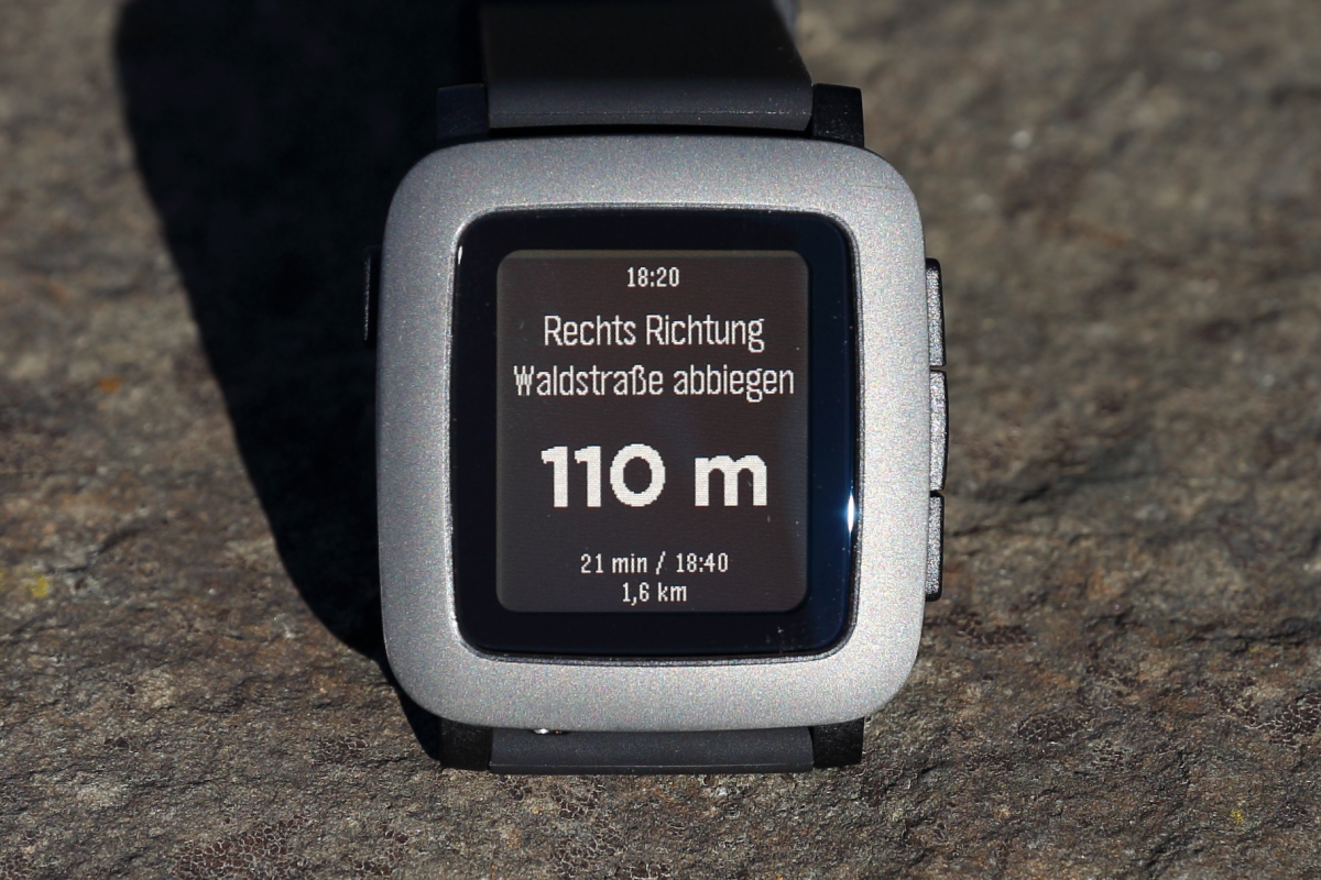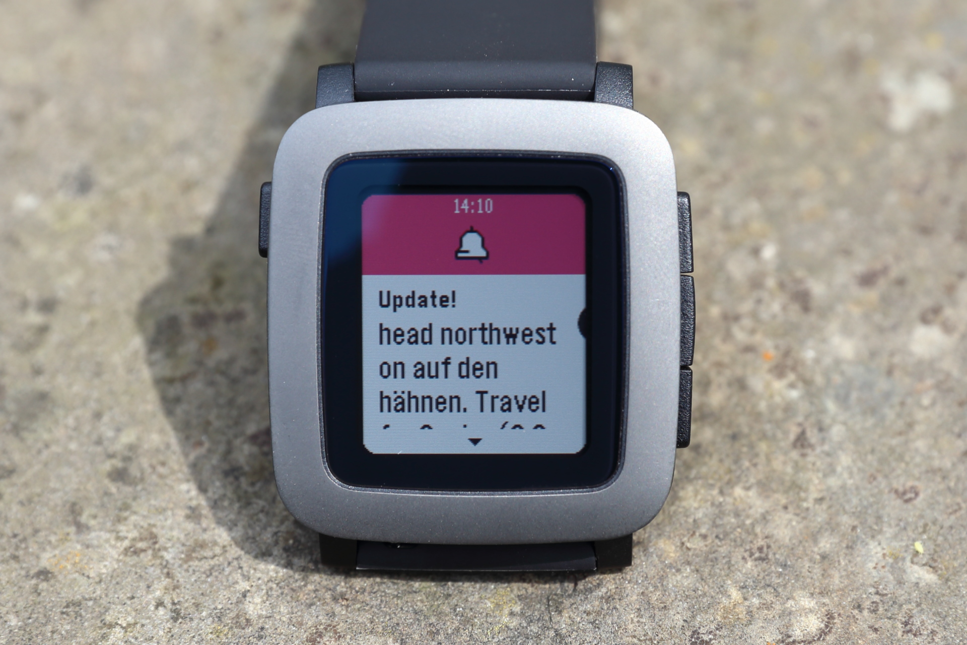Eine ganz andere Art der Navigation wird über die App Pebble Adventure Navigation angeboten. Zunächst wird in der Smartphone Begleit-App eine Route berechnet. Es stehen unterschiedliche Profile für Fußgänger, Radfahrer oder Kfz zur Verfügung. Sobald die Navigation auf dem Smartphone gestartet wurde, bekommt man zu jedem Manöver eine Pebble-Benachrichtigung, eine extra App ist auf der Pebble dazu nicht notwendig. Leider sind die Texte nur in englisch verfügbar und die Entfernung wird nur zum Zeitpunkt der Benachrichtigung angezeigt. Man muss sich die Navigation so vorstellen, als würde man vor jeder Kreuzung eine SMS bekommen, wie weit die Kreuzung noch weg ist und ich welche Richtung man fahren soll. In der Praxis konnten wir mit dieser Art der Navigation relativ wenig anfangen.