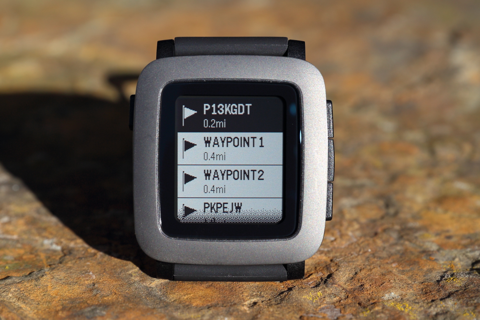 Pebble Navigation/Geocaching gewährt eine puristische Navigation und zeigt Richtung und Entfernung zu einem über das Smartphone ausgewählten Ziel an.