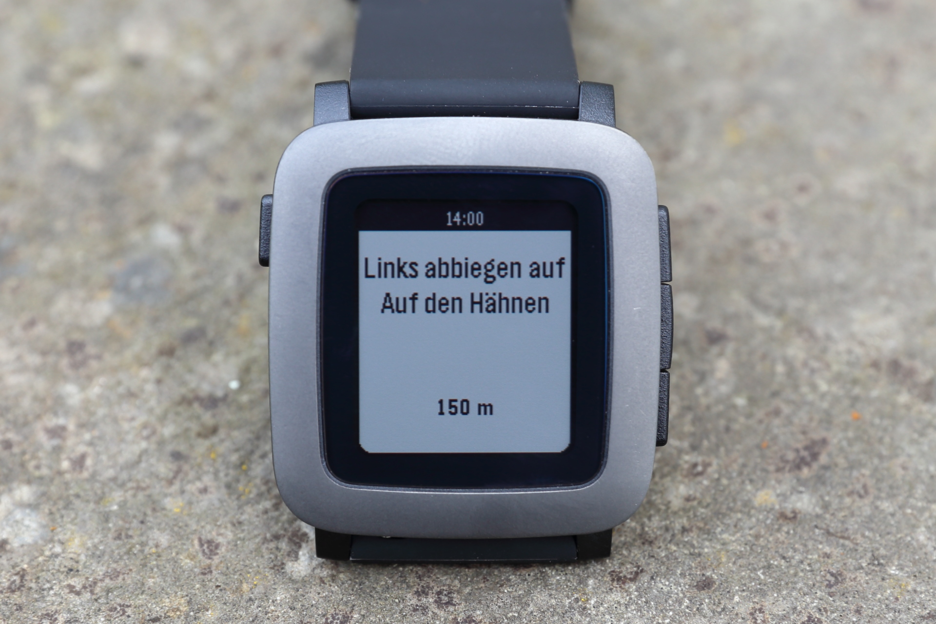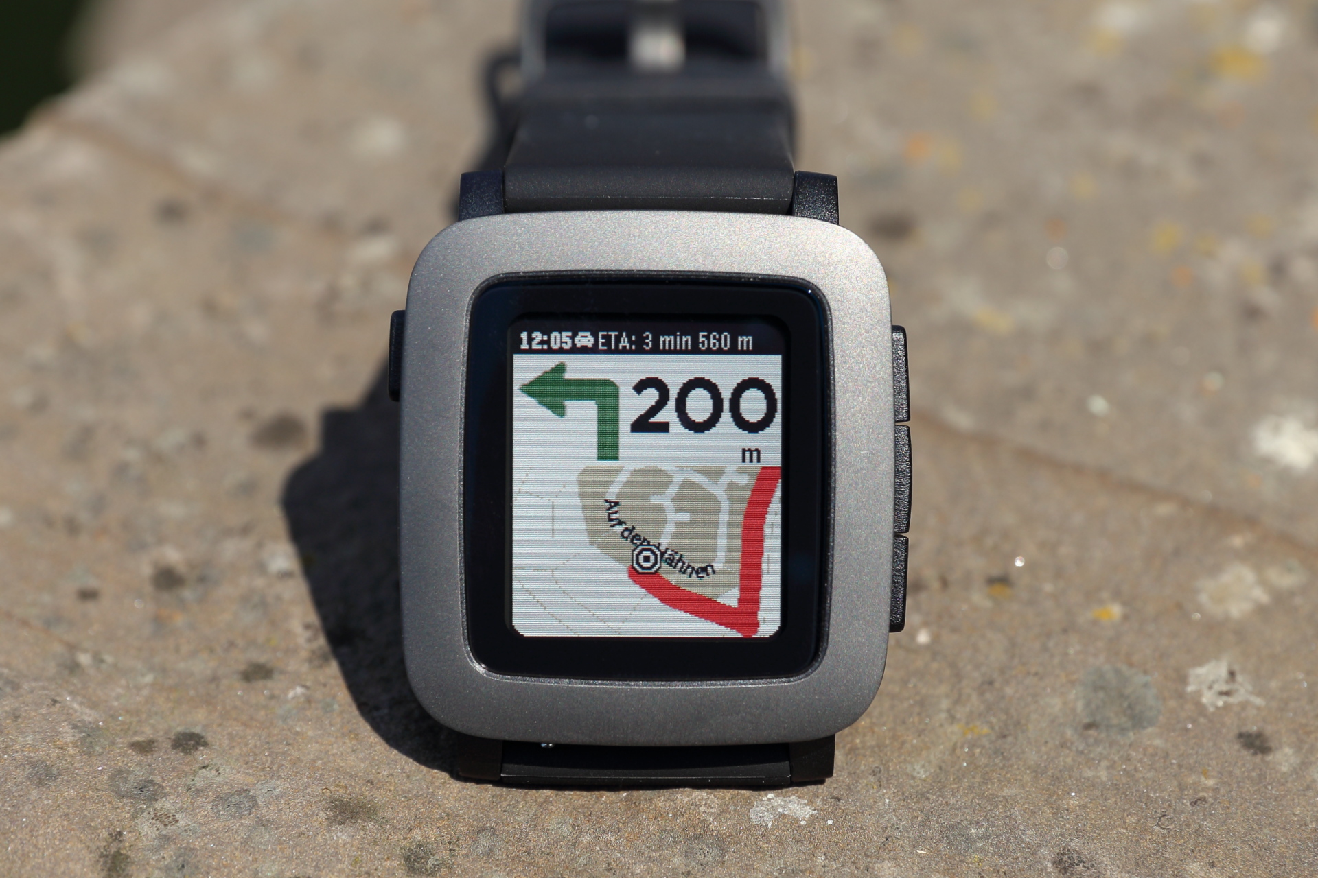 Pebble Pilot zeigt Navigationshinweise der Routenberechnung aus der Begleit-App an. Die Hinweise sind in unserem Test als unbrauchbar durchgefallen.