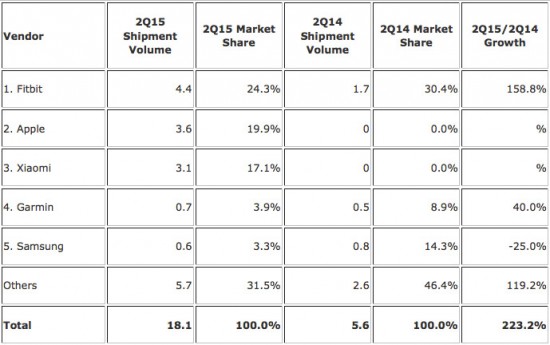 Mit dem Einstieg in den Wearable-Markt verdrängte Apple die weiteren bedeutsamen Hersteller jeweils um eine Position nach unten. So kommt das bislang nur in China aktive, aber dort sehr erfolgreiche Unternehmen Xiaomi mit seinem Fitness-Armband Mi Band und 3,1 Millionen verkaufen Einheiten auf den dritten Platz. Garmin verkaufte unverändert zum ersten Quartal 2015 weiterhin 0,7 Millionen Fitness-Uhren und -Armbänder, ein Wachstum von 40 Prozent gegenüber dem Vorjahr.