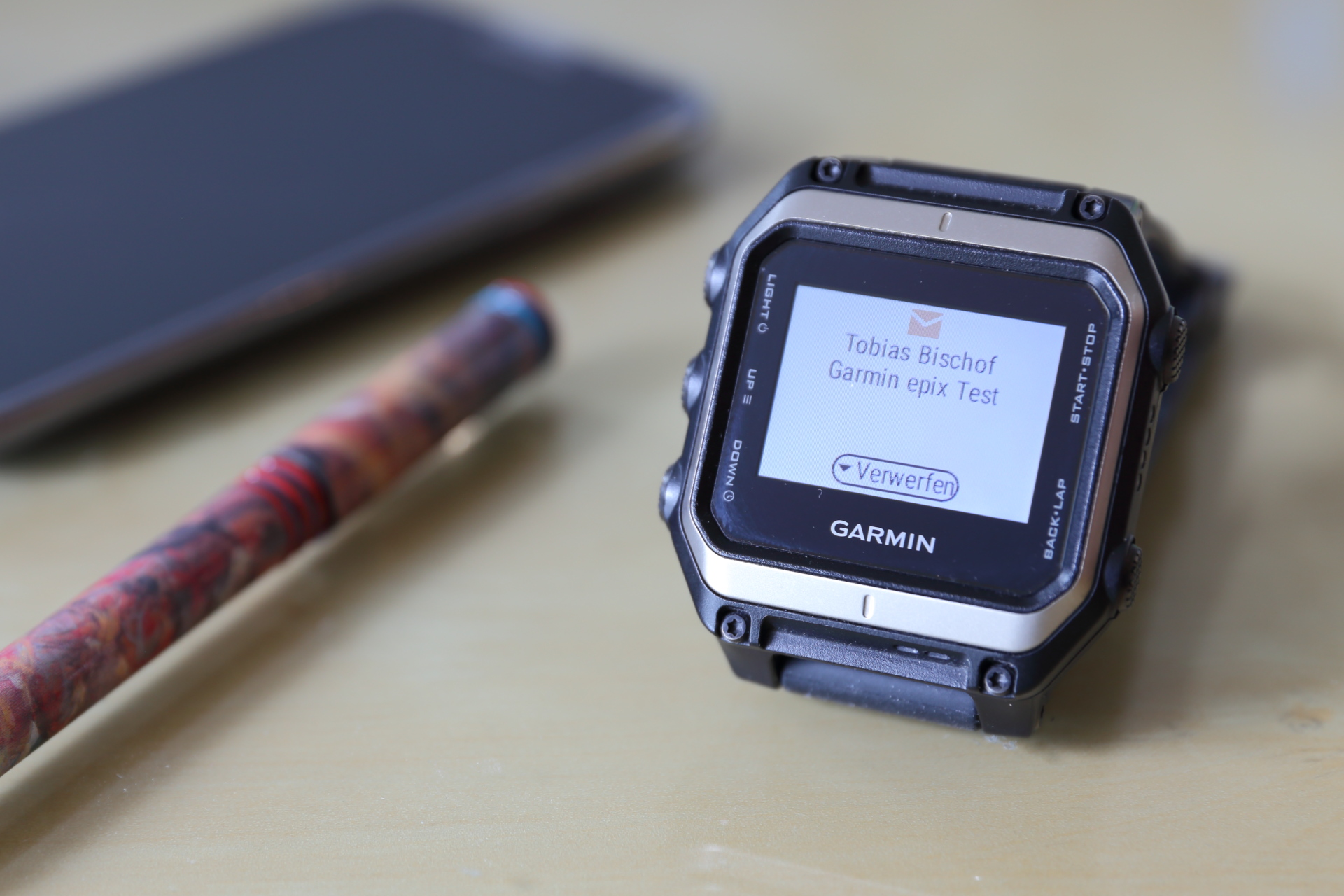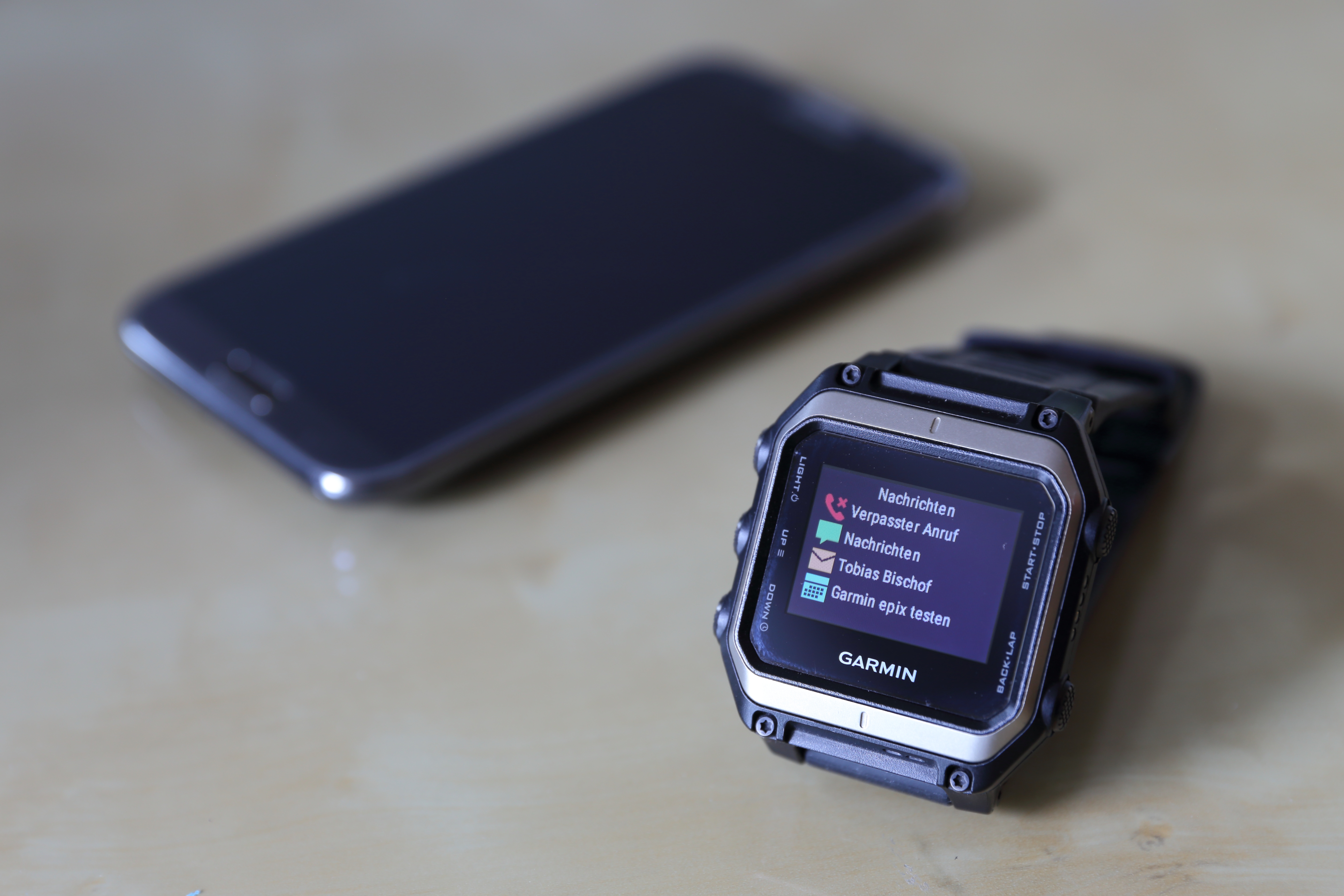 Gemessen an den Möglichkeiten einer Apple Watch, einer Pebble Time (hier von uns getestet) oder anderen ausgewachsenen Smartwatches, erscheinen die Funktionen der Garmin epix rudimentär. Verklickt man sich, sind die Benachrichtigungen gelöscht und es besteht keine Möglichkeit, eine Liste der SMS oder E-Mail erneut auszulesen. Der Vorschautext wurde in unserem Test oft nicht angezeigt, eine genaue Ursachenforschung haben wir an dieser Stelle nicht unternommen. Es besteht keine Möglichkeit, auf E-Mails oder SMS zu antworten oder einen Anruf entgegenzunehmen. Über IQ-Connect-Apps und Widgets können einige weitere Smartwatch-Funktionalitäten wie z.B. das Übertragen von Notizen oder die Darstellung von Börsenkursen installiert werden.