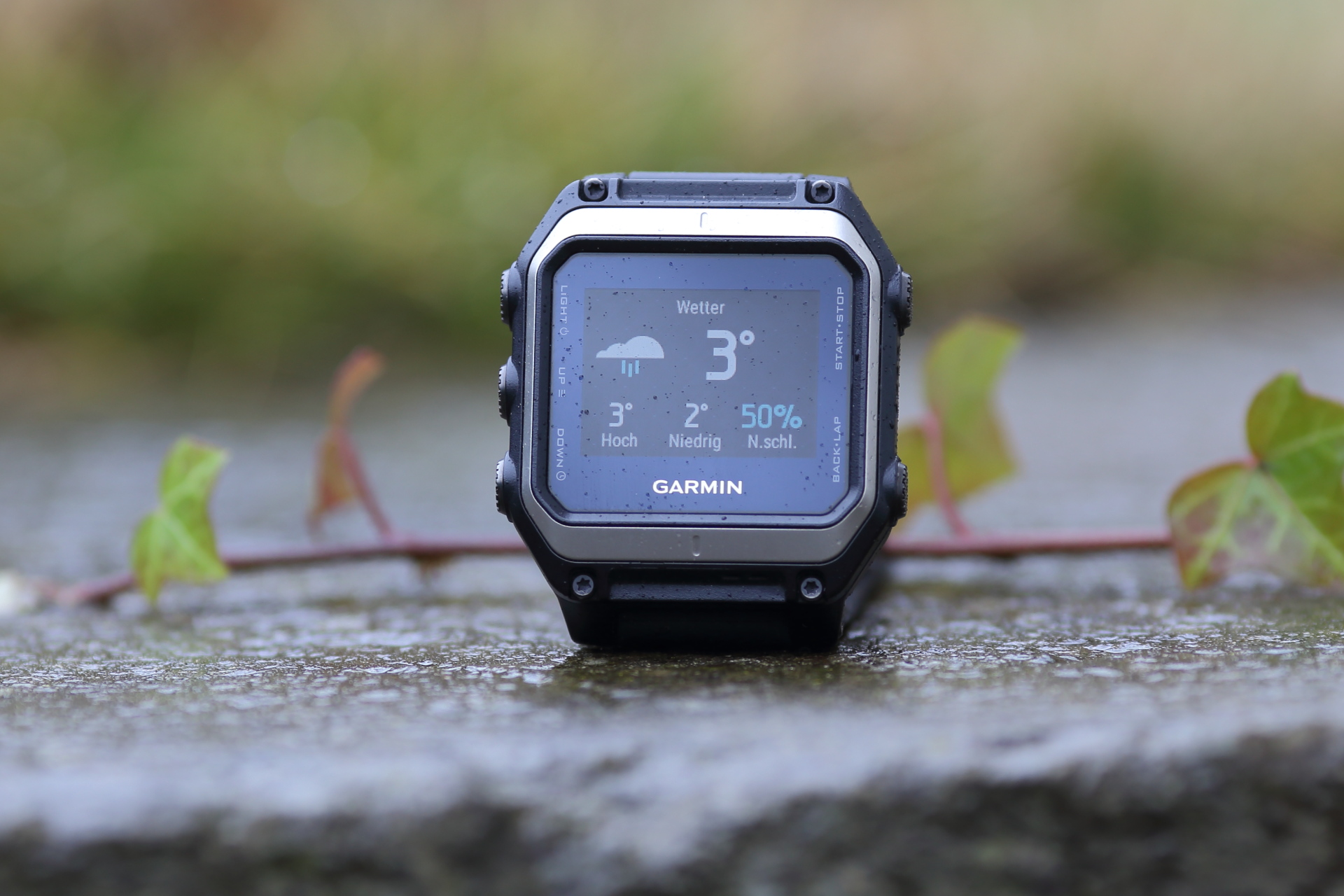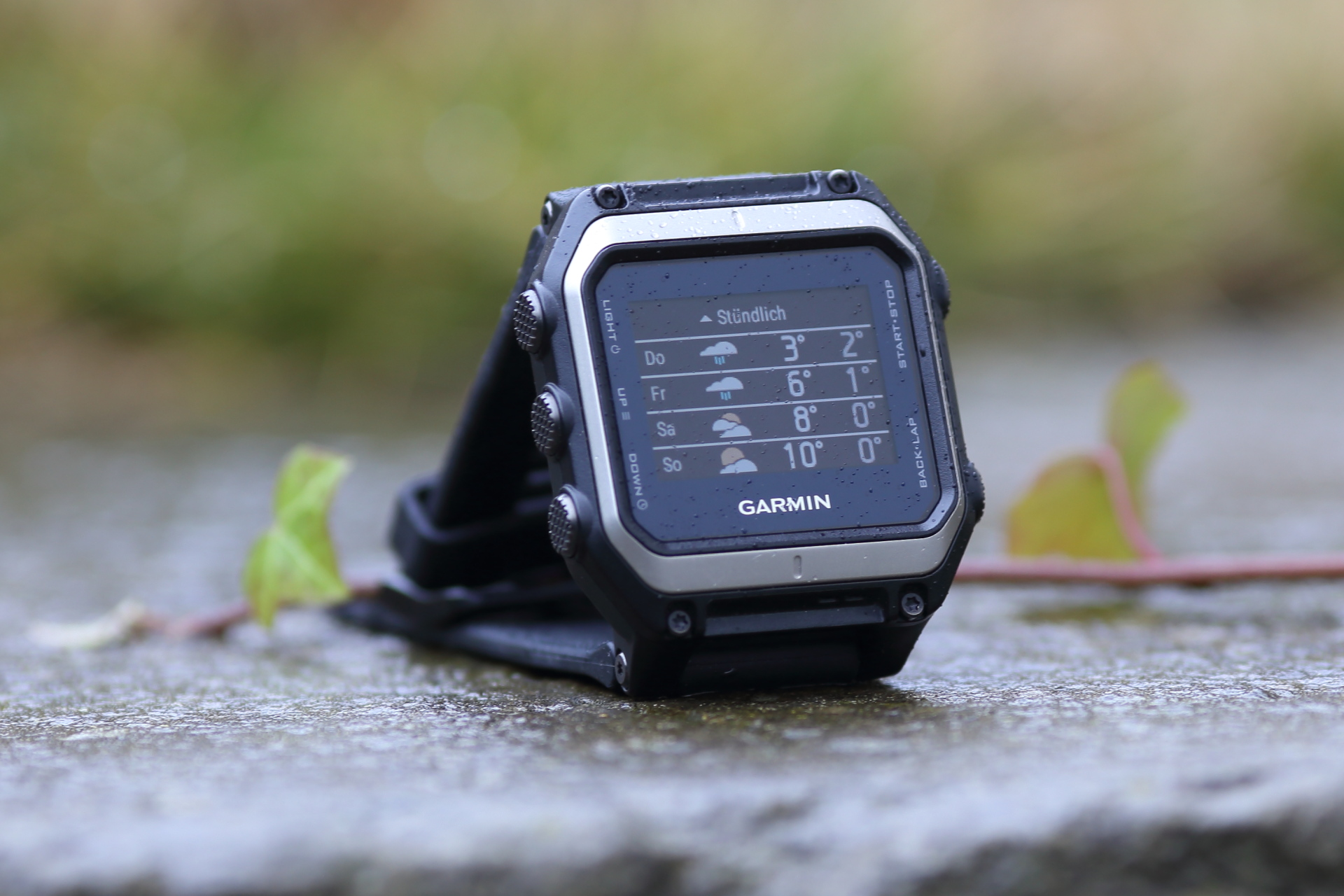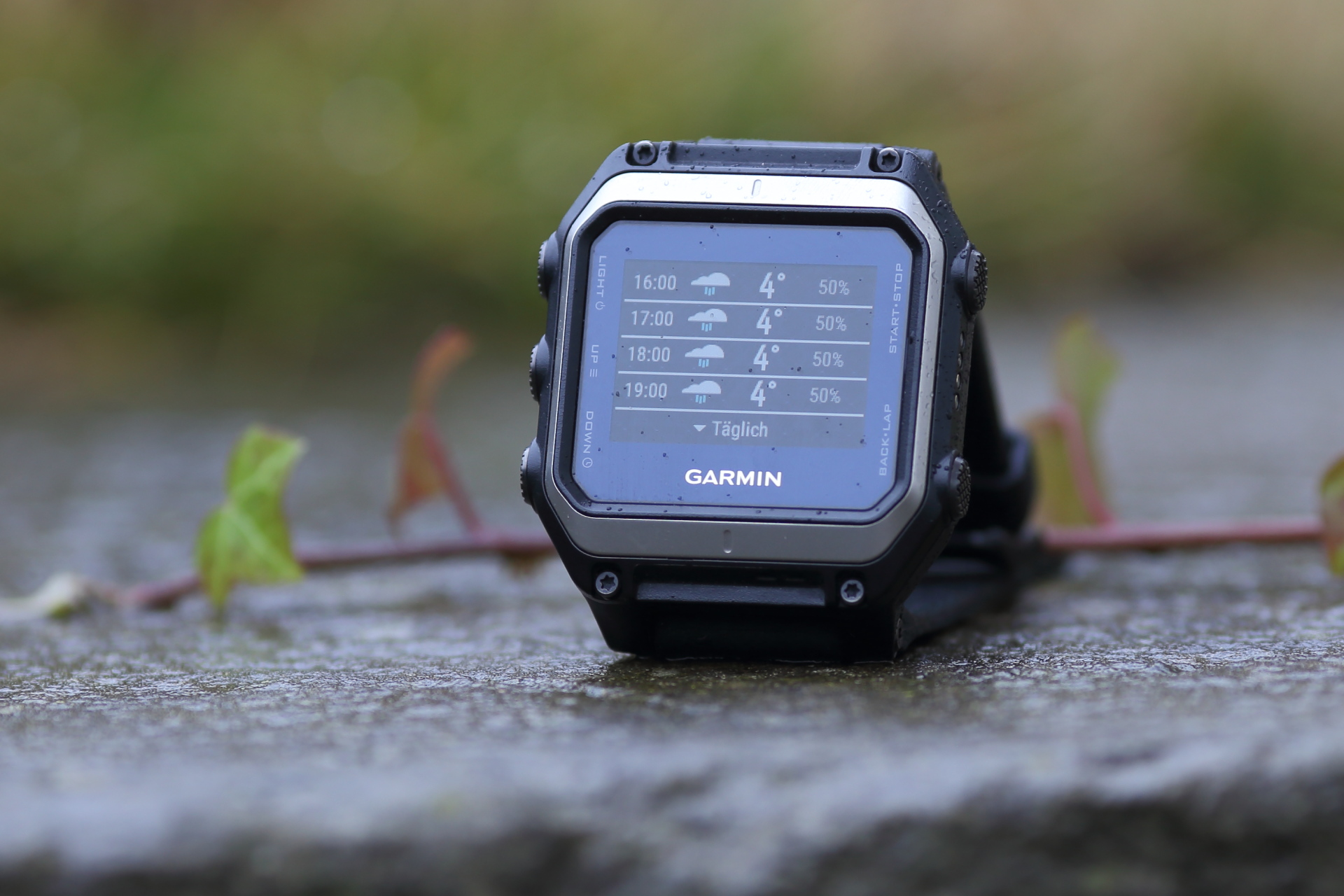 Die Anzeige der Wetterdaten und der Wettervorhersage ist bei der Garmin epix gut gelungen. Es gibt eine Anzeige des aktuellen Wetters, der Vorschau für die nächsten Stunden und eine 3-Tage-Vorschau, welche leider ohne Anzeige der Niederschlagswahrscheinlichkeit auskommen muss. Das Abrufen von Wetterdaten ist nur für den aktuellen Standort möglich.