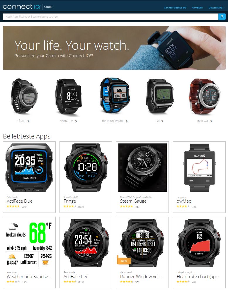 Viele weitere Funktionen stehen als Apps, Widgets, Watchfaces oder Datenseiten wie bereits beschrieben über den IQ-Connect Store zur Verfügung. Die vorhandenen Erweiterungen können auch ohne angeschlossenes Gerät im Internet durchsucht werden: IQ-Connect Store