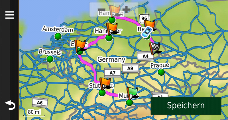 Die Karte des Becker professional.6 LMU lässt sich von allen Testkandidaten am schnellsten und ohne wesentliche Nachladezeiten verschieben und zoomen, so macht es Spaß, Ziele aus der Karte auszuwählen und auch mal links und rechts von der Route Ausschau zu halten. Die Garmin nüviCam und das MEDION GoPal E5470 bieten ebenfalls eine ordentliche Performance. Garmin ist der einzige Hersteller, welcher den Detailgrad der Karten in drei Stufen einstellbar macht, so kann der Nutzer zwischen einem besonders schnellen Kartenaufbau mit etwas weniger Details und einer besonders detaillierten, aber etwas langsameren Karte wählen kann. Die Karte des Falk NEO 640 LMU lässt sich eigentlich sehr flüssig und schnell bedienen, allerdings ist der resistive Touchscreen bei der Fingerbedienung sehr träge. Nutzt man z.B. einen Eingabestift, so ist die Karte nicht wesentlich langsamer als bei Becker. Im Gegensatz dazu benötigt das TomTom GO 6100 immer einen Moment um das Kartenbild zu zeichnen. Die Karte ist nach dem Verschieben oder Zoomen zwar direkt zu sehen, aber zunächst leicht unscharf. Nach 1-2 Sekunden wird die Karte dann wieder normal dargestellt. Bei Blaupunkt und Mio macht es deutlich weniger Spaß mit der Karte zu arbeiten. Der Kartenaufbau benötigt je nach Zoomstufe deutlich zu lange.