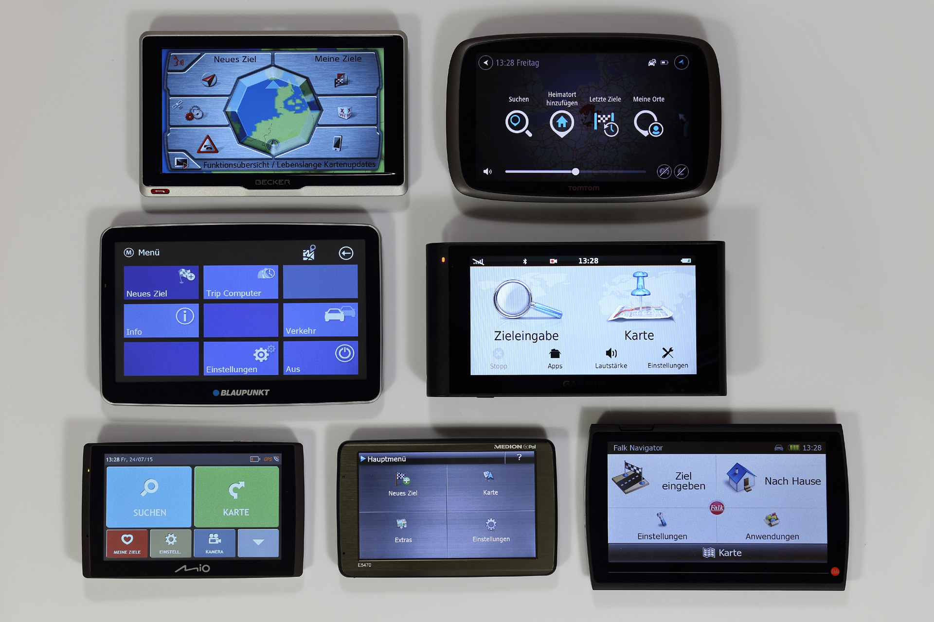 TomTom bietet eine Benutzeroberfläche, welche vor allem durch app-typische Wischbewegungen gesteuert wird. Diese Bedienung wirkt auf uns nicht immer effizient, da z.B. zum Erreichen der Einstellungen weite Wege zurückgelegt werden müssen. Die Einstellungen wirken sehr textlastig und weniger aufgeräumt. Das Falk NEO 640 LMU verwendet ein sehr einfaches Menü, mit dem jeder sofort zurechtkommen wird. Allerdings gibt es bei Falk wenig Möglichkeiten, Einstellungen direkt auf der Karte vorzunehmen. Die Software von Mio und Blaupunkt sind nach unserem Empfinden etwas weniger intuitiv zu bedienen. Das Mio hat ein zwar ein übersichtliches Hauptmenü, die Einstellungen aber sind textlastig und nicht immer selbsterklärend.