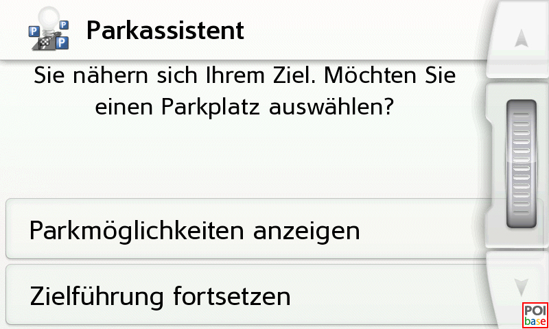 Beim Finden eines Parkplatzes kann der Parkassistent unterstützen. Der Helfer meldet sich auf den meisten Geräten kurz vor Ankunft am Zielort und schlägt eine Parkmöglichkeit in der näheren Umgebung vor. Nach dem Parken führen einige Geräte über die Fußgängernavigation weiter zum Ziel. Bei Garmin kann das eigentliche Ziel auch an die App Smartphone Link übergeben werden, anschließend wird auf dem Smartphone der weitere Weg angezeigt. Die Parkposition merkt sich die App dabei ebenfalls und hilft somit auf dem Rückweg beim Wiederfinden des eigenen Fahrzeugs.