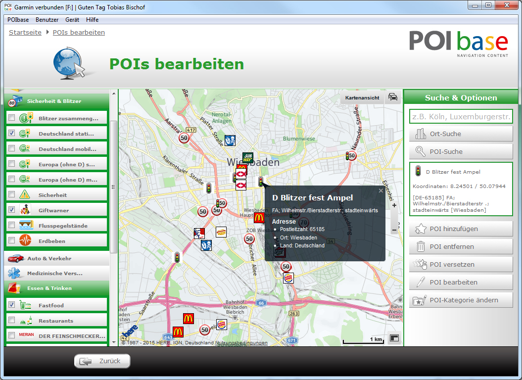Mit POIbase können Nutzer nicht nur bereits vorhandene Sonderziele auf ihrem Navigationsgerät installieren. Auch eigene POIs können eingetragen und mit anderen Mitgliedern der POIbase-Community geteilt werden. Die Verwaltung eigener und bereits bestehender POIs erfolgt über eine interaktive Karte. POIbase bietet mittlerweile über 1 Million zusätzlicher Ziele aus den verschiedensten Kategorien an, darunter auch ein Blitzer-Warner, ein Apothekennotdienst oder Standorte der unterschiedlichsten Einkaufsmöglichkeiten. Wer sein Navi gerne auch abseits der Straße einsetzt, findet bei POIbase auch eine Liste mit Geocaches oder einen Dienst, der Hundebesitzern gefährliche Gebiete anzeigt, in denen Giftköder gefunden wurden.