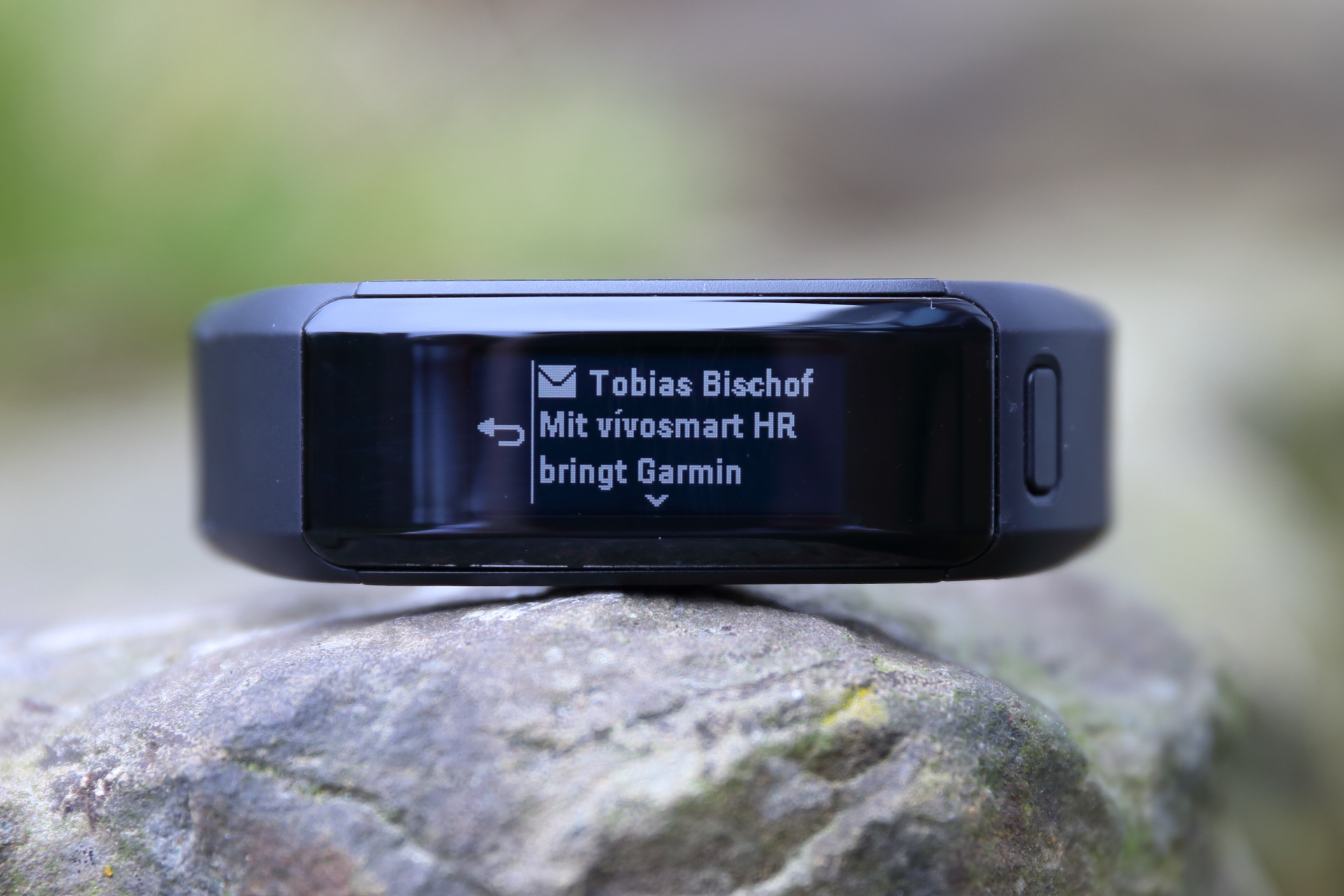 Im Gegensatz zum vivofit 2 verfügt das vivosmart HR wie der Name vermuten lässt über einige Smartwatch-Funktionen. Ist das Armband mit einem kompatiblen Smartphone gekoppelt, können Anrufe, SMS, E-Mails und Kalendererinnerungen am Armband abgerufen werden. E-Mails werden mit Betreff und Absender sowie einer Vorschau des Textes (ca. 350 Zeichen) dargestellt. Leider ist die Textvorschau nur dann vorhanden, wenn nicht mehr als eine E-Mail-Benachrichtigung vorliegt, ein Umstand, welchen wir schon bei beim vivosmart kritisiert haben. Leider gibt es keine Möglichkeit auf Benachrichtigungen zu antworten, auch das Annehmen eines Anrufes ist nicht möglich.